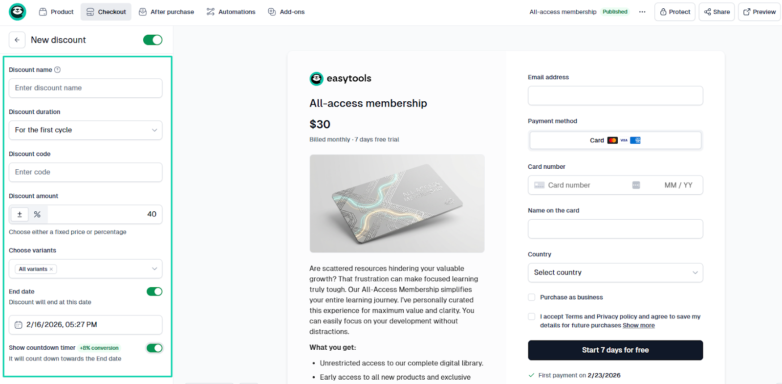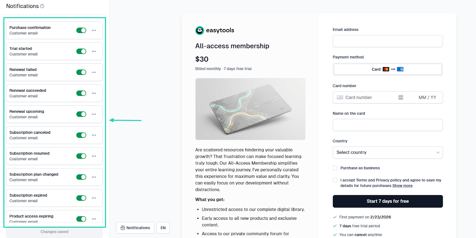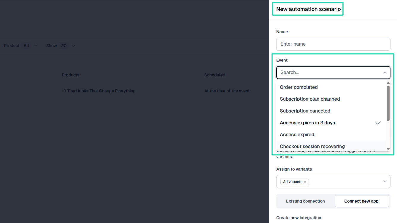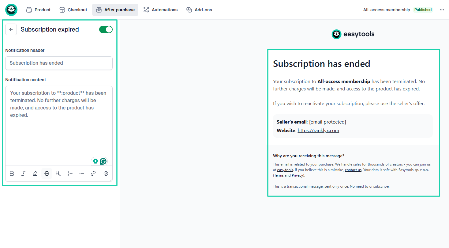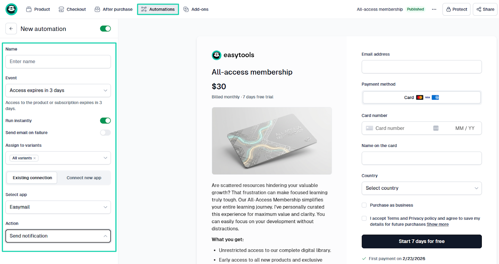 With Easytools, you can create automations for many events. Like “Order completed,” “Subscription plan changed,” "Subscription canceled,” “Access expires in 3 days,” “Access expired,” and more.