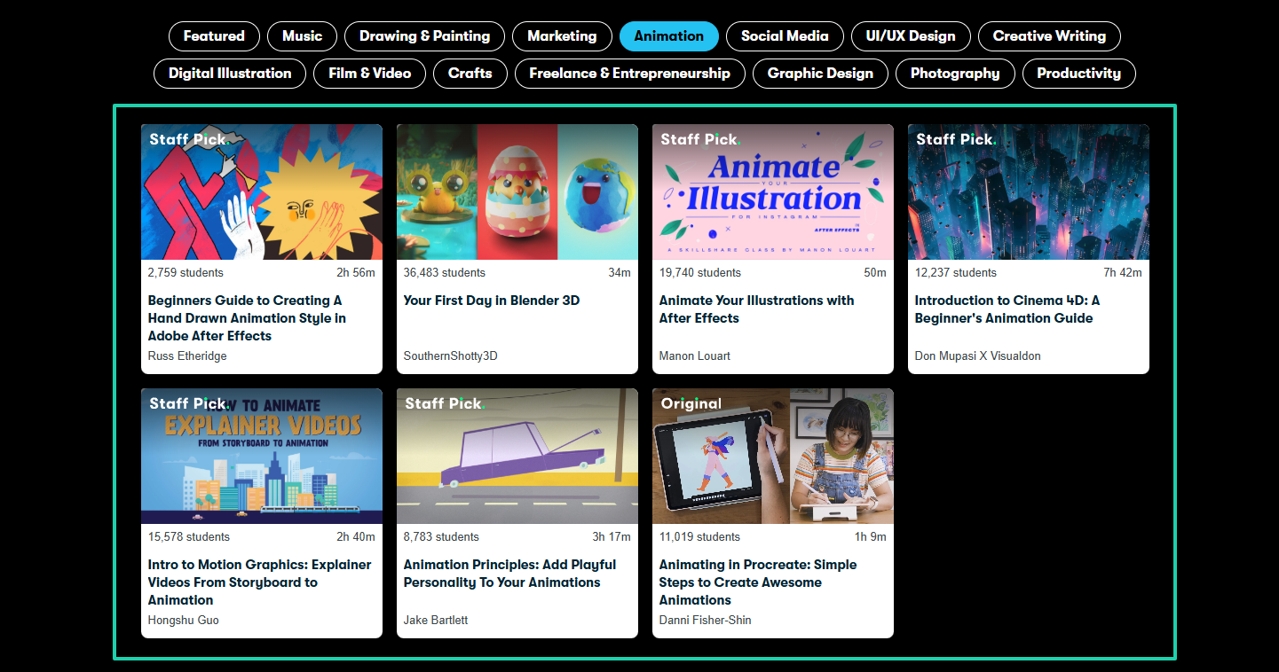 For example, the Animation category has seven courses.