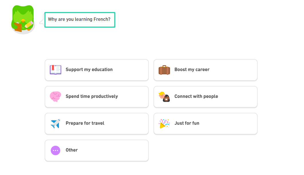 The platform wants to know the reason why you want to learn the language you selected. You can even select your reason among the ones they prepared.