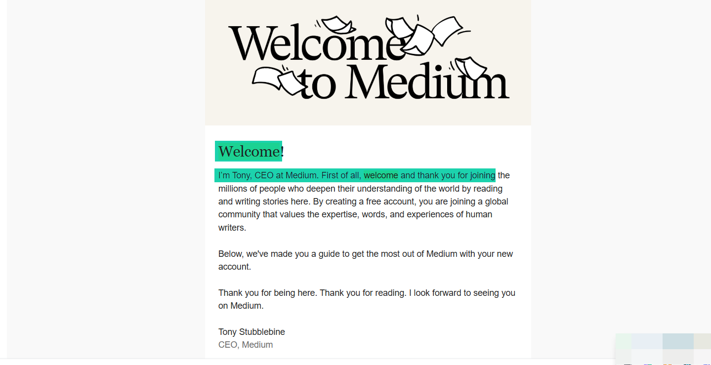 Medium, for instance, sends you an email after you sign up on behalf of Tony Stubblebine, the CEO, that welcomes and thanks you.