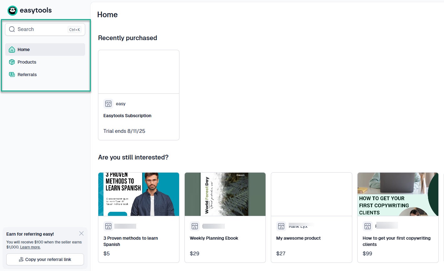 In Easytools, your customers can view order history, access downloads, manage subscriptions, update payment details, and find invoices in one place. They can also browse recently viewed products.