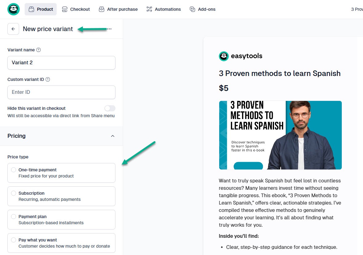 Yes. Easytools lets you generate checkout links for specific product variants, pricing options, or promotions. You can share different links for different audiences, such as early buyers, partners, affiliates, or email subscribers.