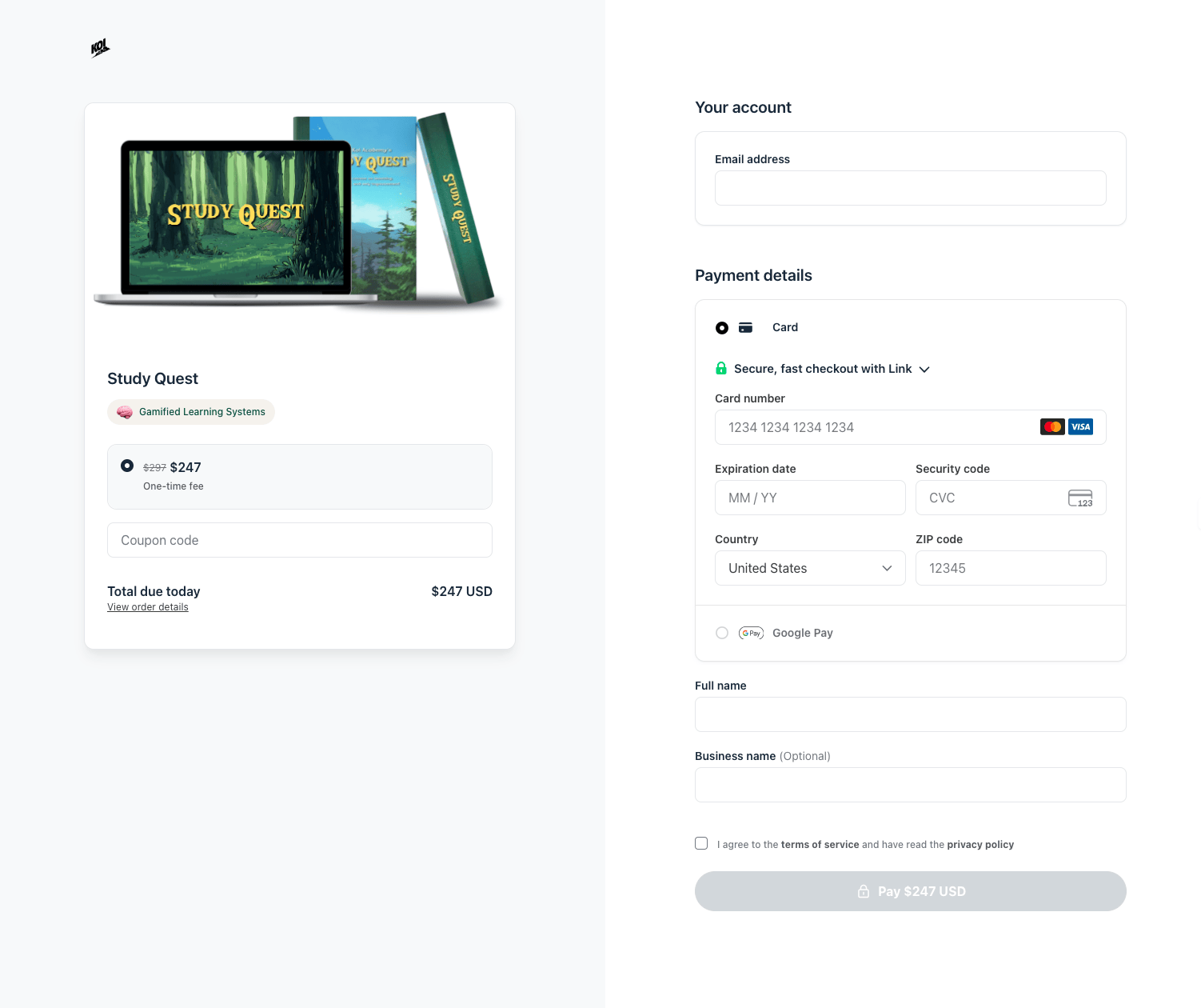 This is the checkout for their popular Study Quest course with pretty clean UI and minimal fields, but there a few ways they could optimize it with Easytools: