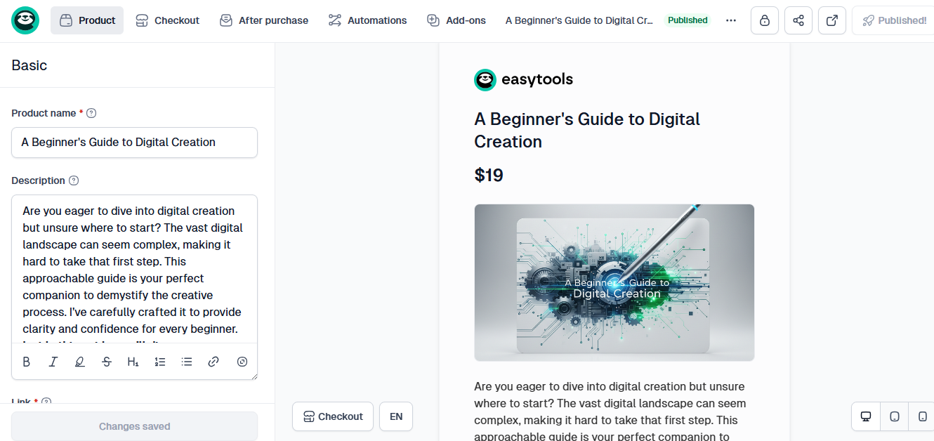 Easytools is an all-in-one platform for creating, selling, and marketing digital products like e-books, online courses, memberships, templates, webinars, and more.