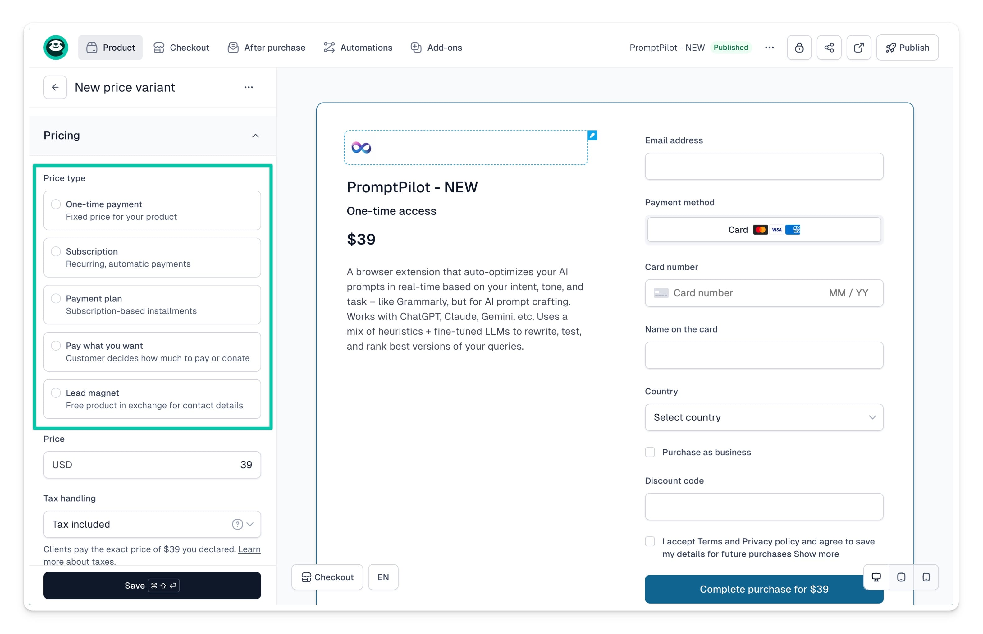 Easytools allows you to quickly create a checkout with various pricing options: one-time payment, subscription, payment plan, PWYW (Pay-What-You-Want) or lead magnet.