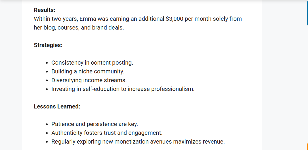 Emma, a marketing executive, turned her small lifestyle blog into a steady $3,000-per-month income stream within two years by consistently posting valuable content.