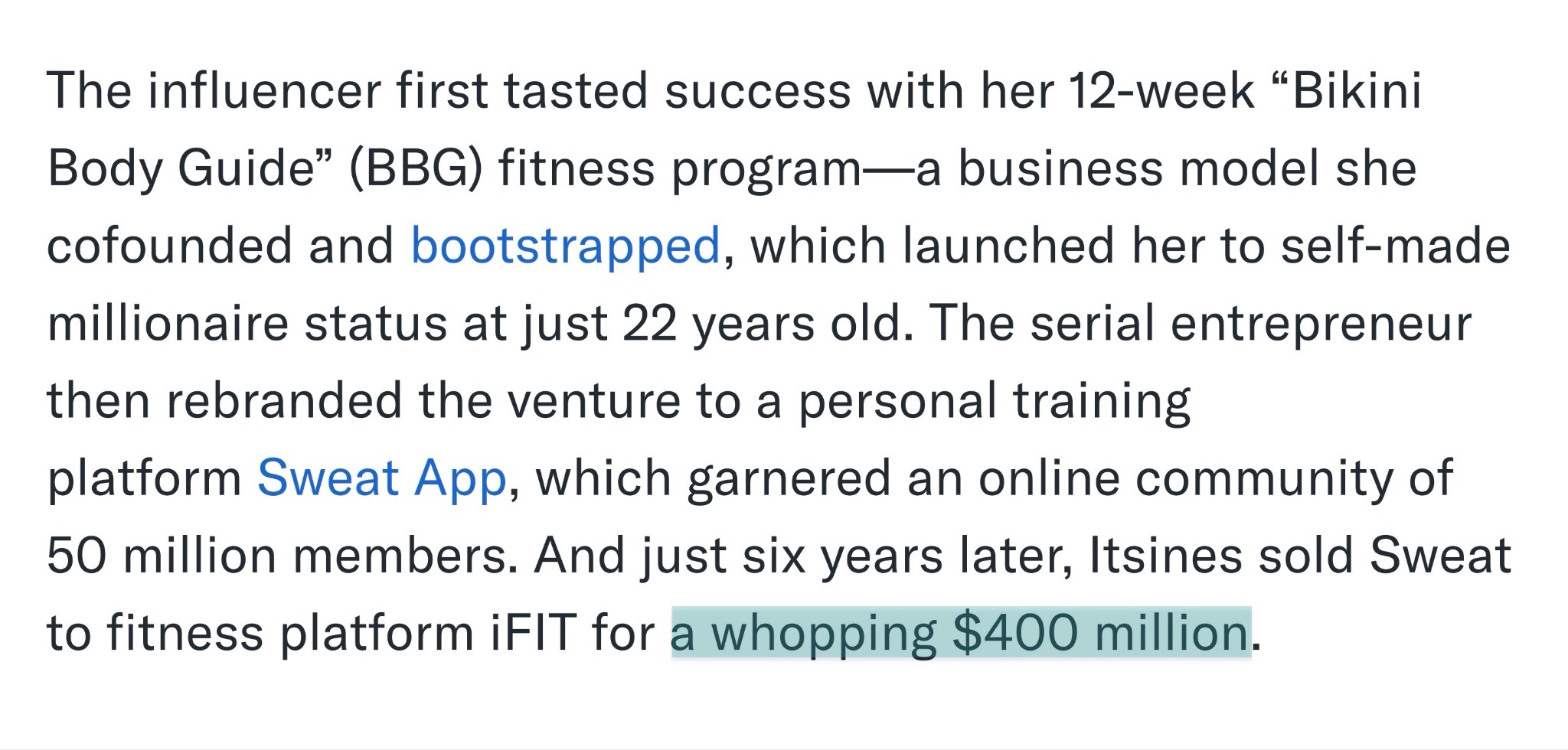 The Sweat app is excellent for home workouts, after all. And she recently sold it for $400M.