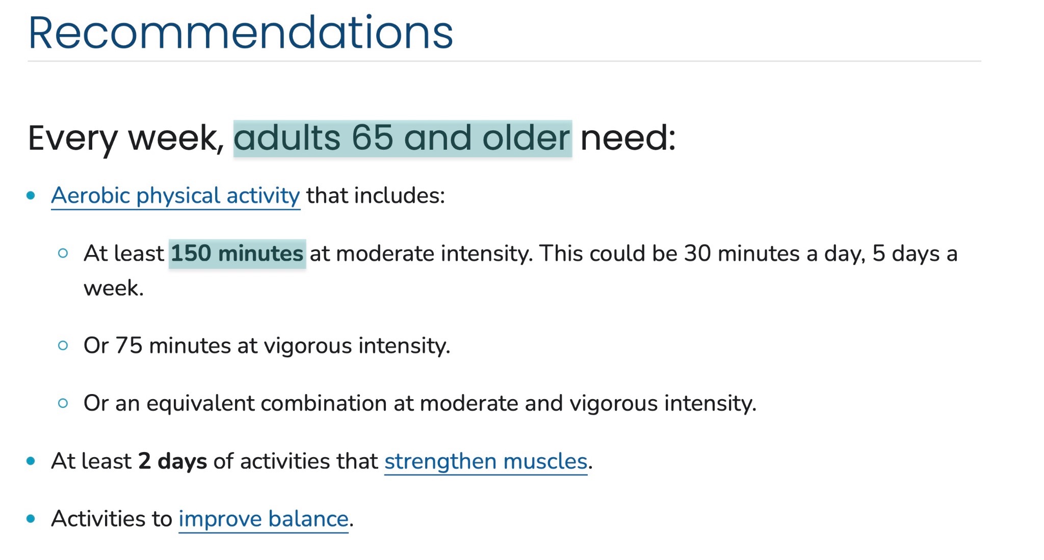 Senior fitness programs for older adults aged 65+ who want to stay active and healthy. Centers for Disease Control and Prevention (CDC) recommends at least 150 minutes of aerobic physical activity for adults in this age bracket.