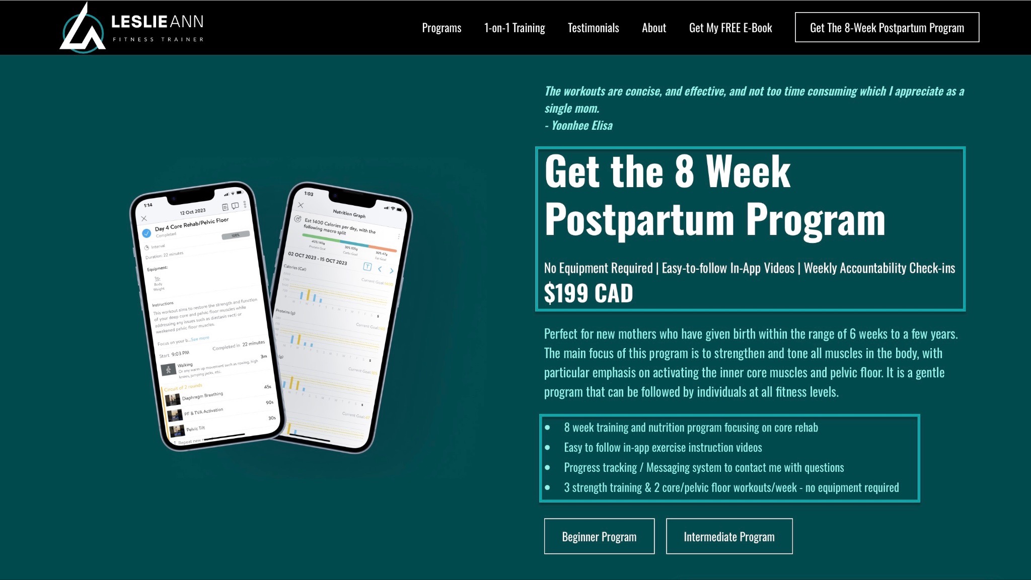 Leslie Ann makes all of this clear in her “8-Week Postpartum Program,” going for CAD $199 (approximately US$144). It’s delivered via a mobile app.