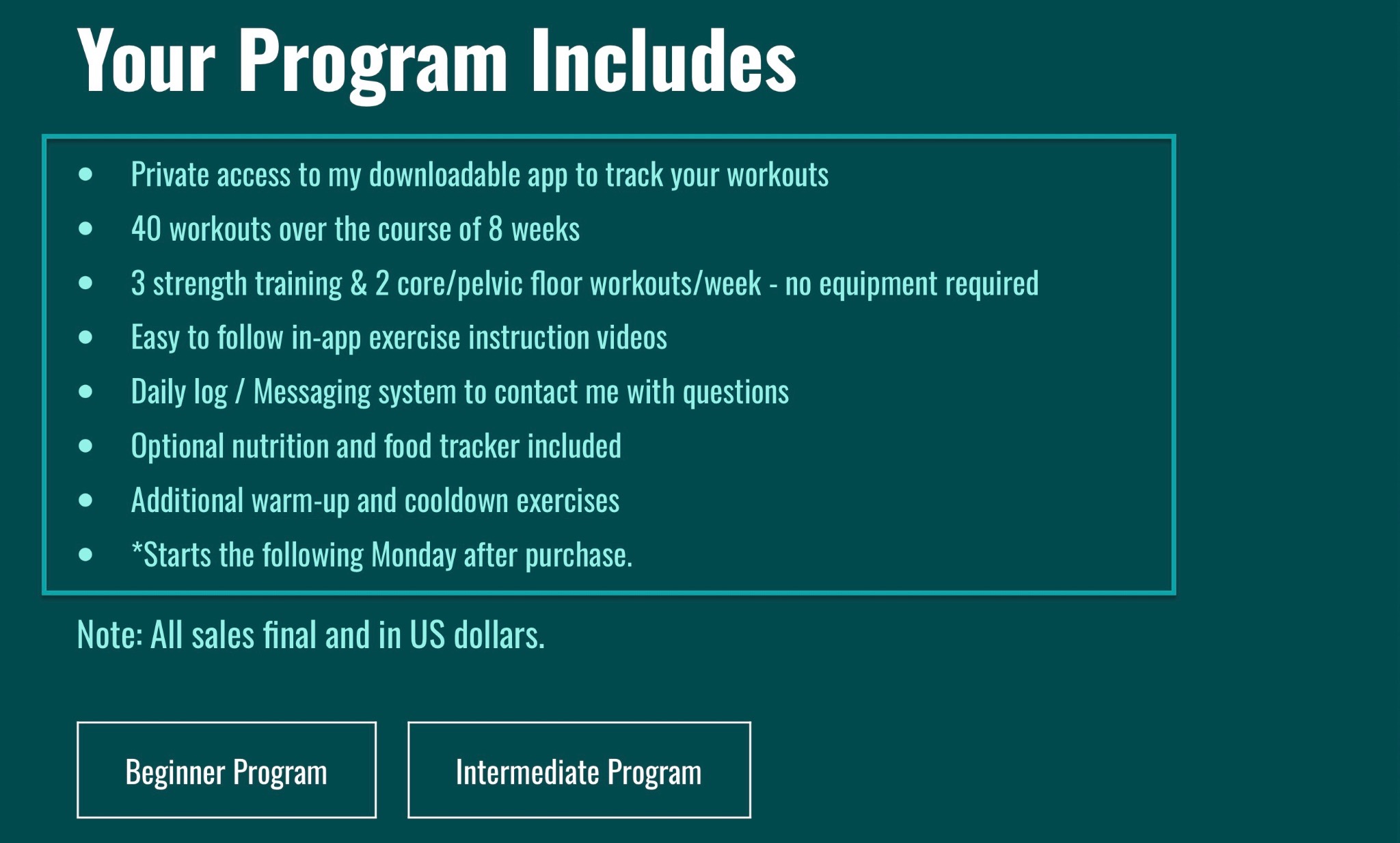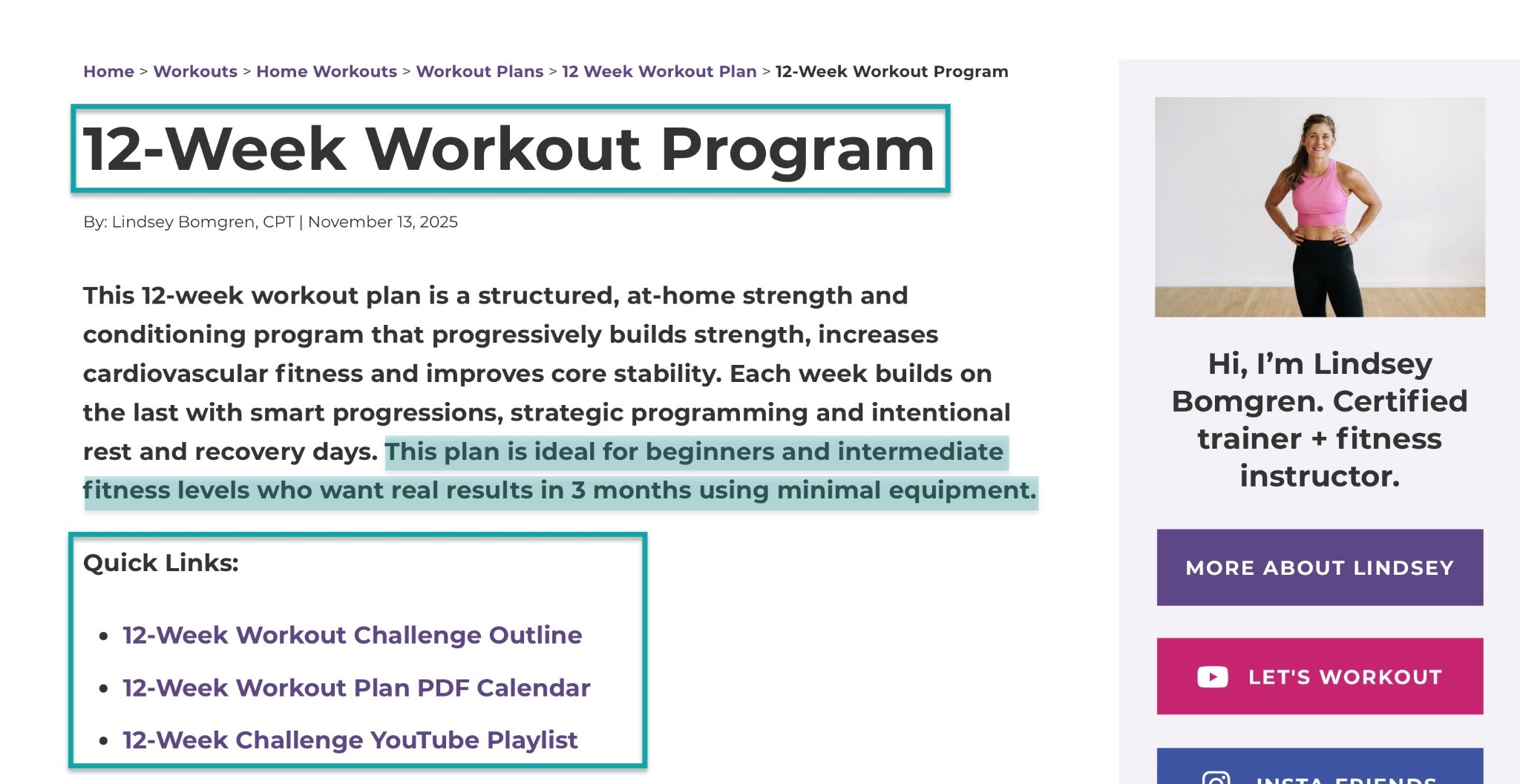 Here’s how Lindsay Bomgren does it. On her website, she sells a “12-week Workout Program.” In her offer, she adds who the program is for: beginners and intermediate fitness levels.
