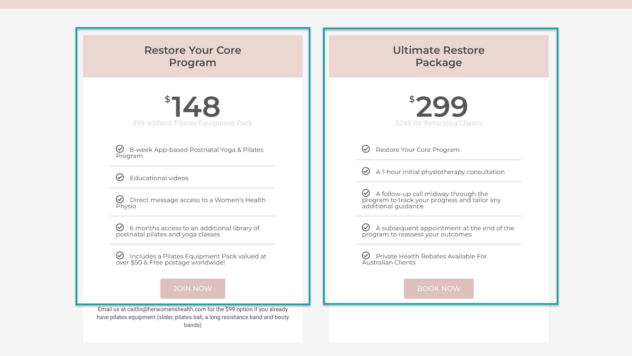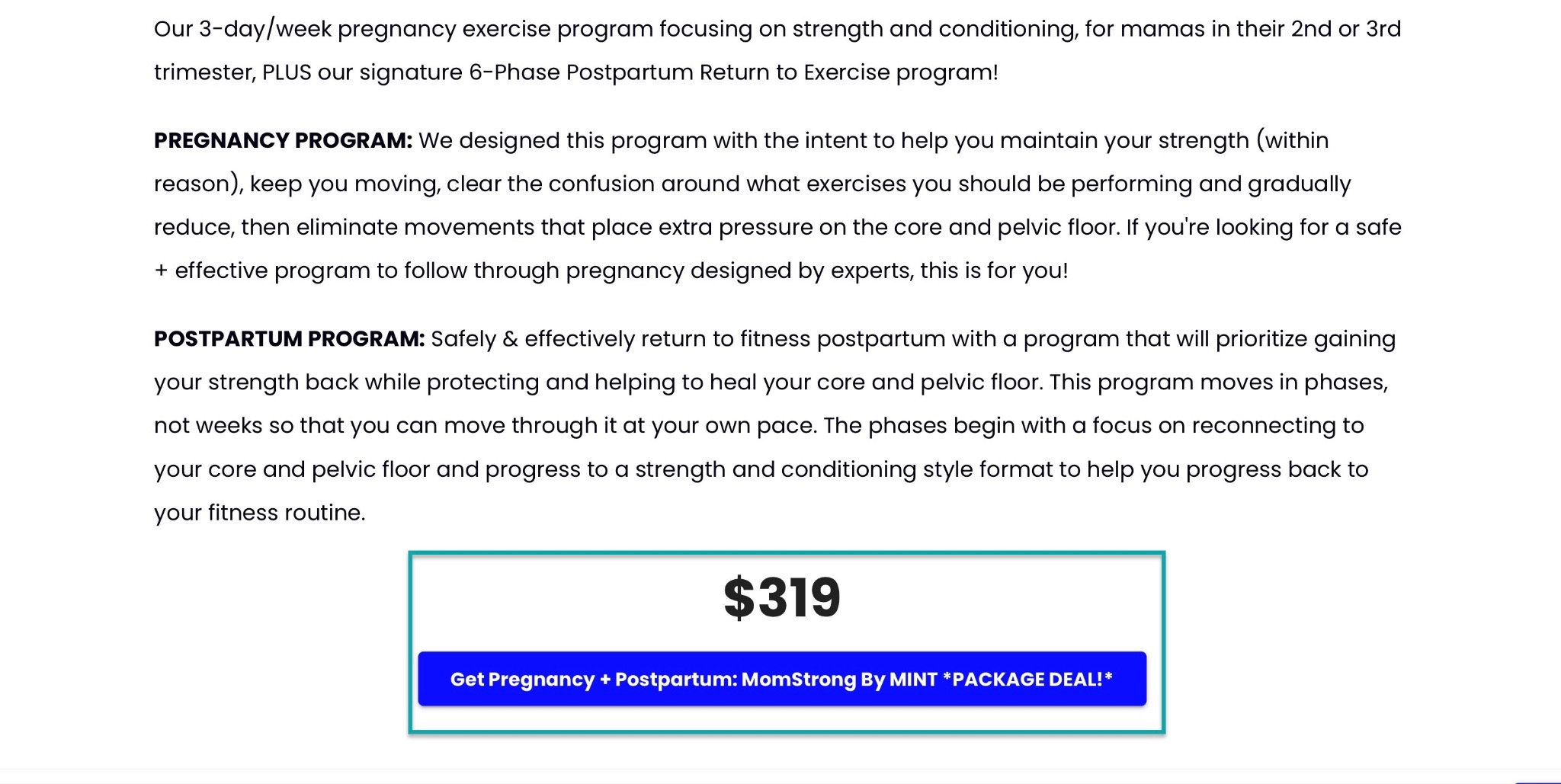 Just like you can see on the landing page of Caitlin’s postpartum fitness program for new mothers. It’s going for $148 and $299, depending on the package.