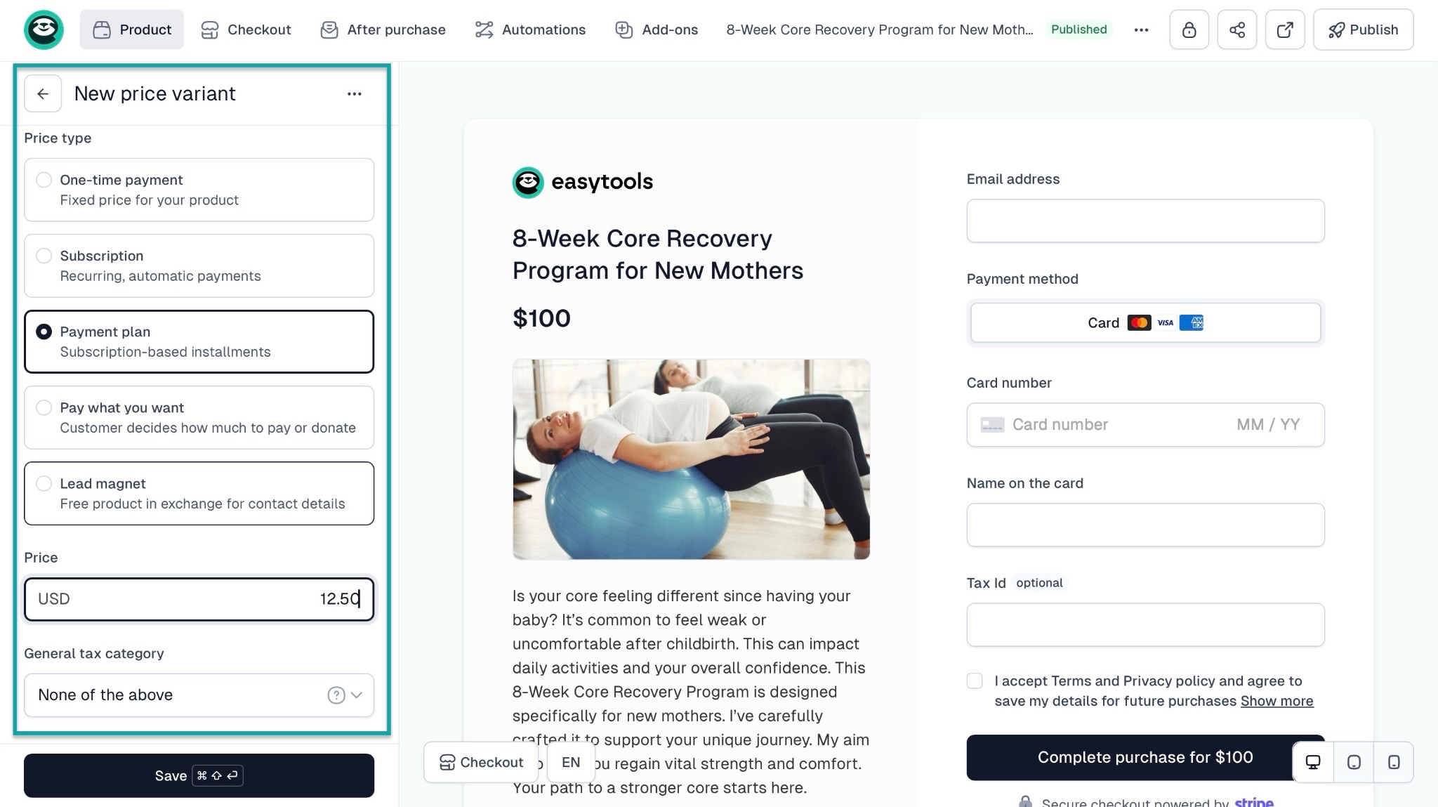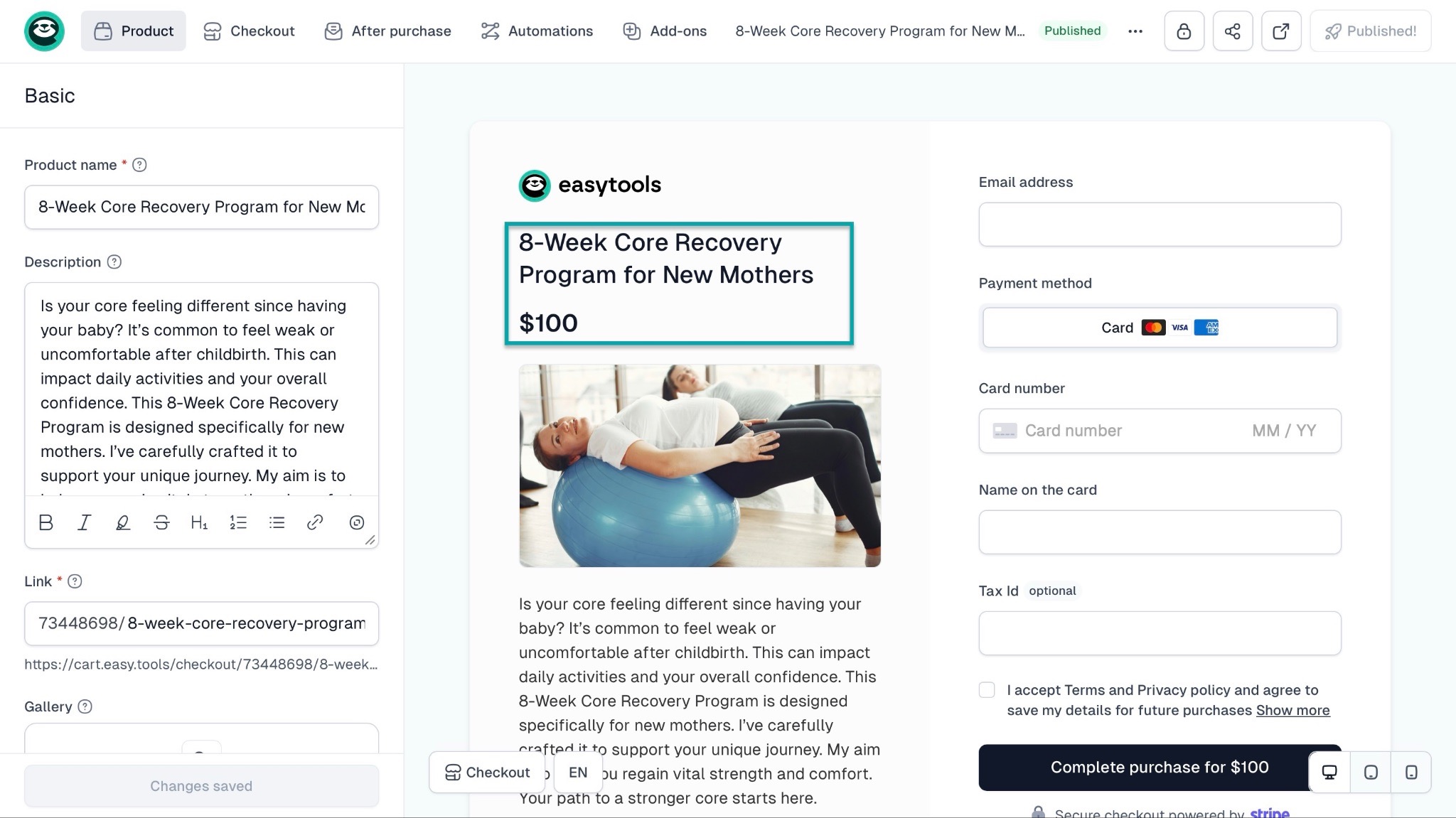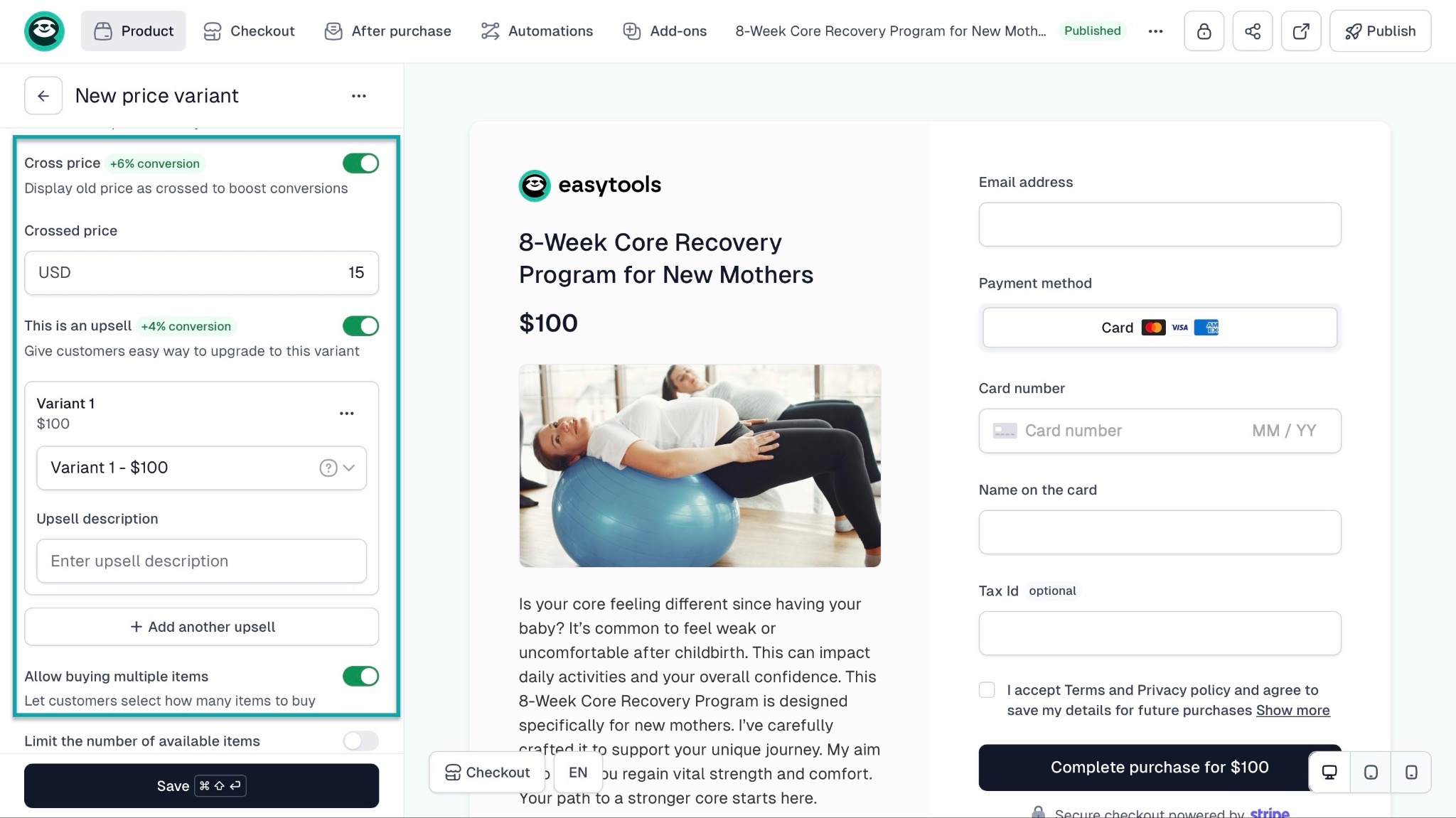 With the right platform, you can use a conversion-focused checkout to sell more. For example, on Easytools, you can create a checkout for your fitness program.