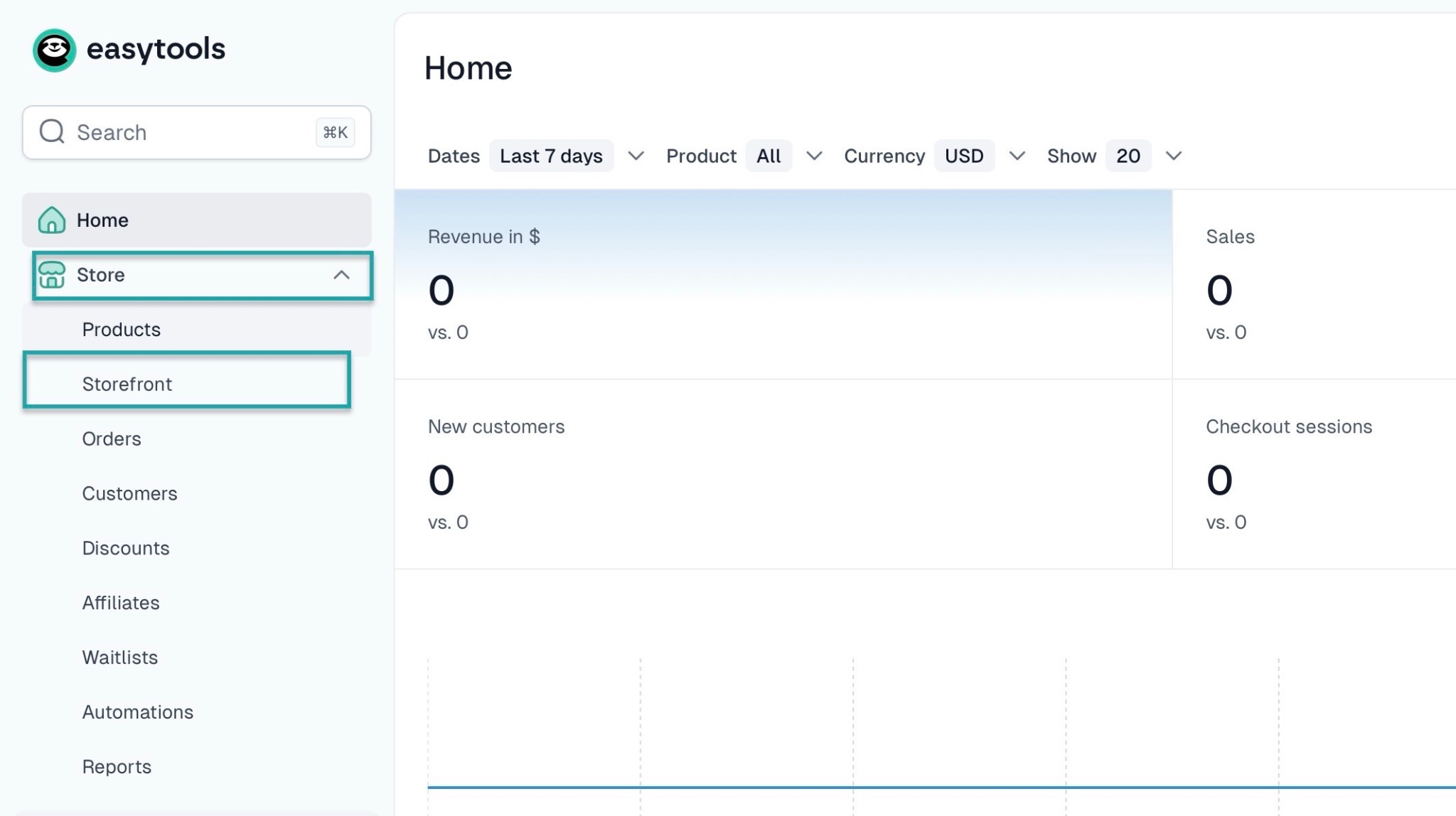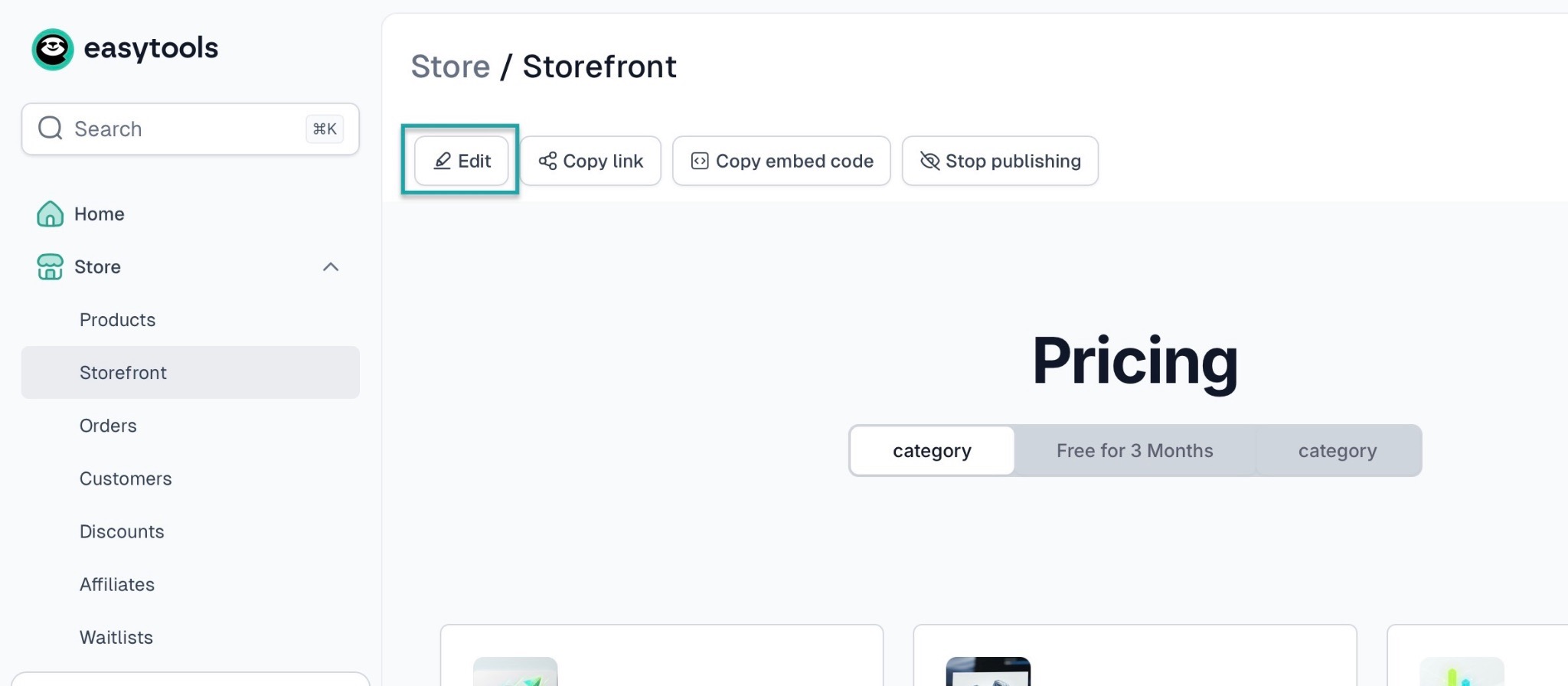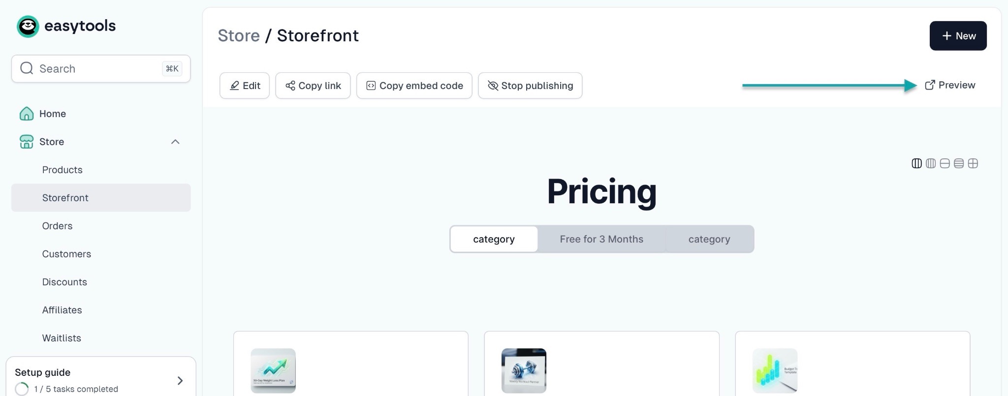 On Easytools, you can create a storefront in a few steps to showcase your fitness programs. First, click “Store” in the sidebar and select “Storefront" right from the homepage.