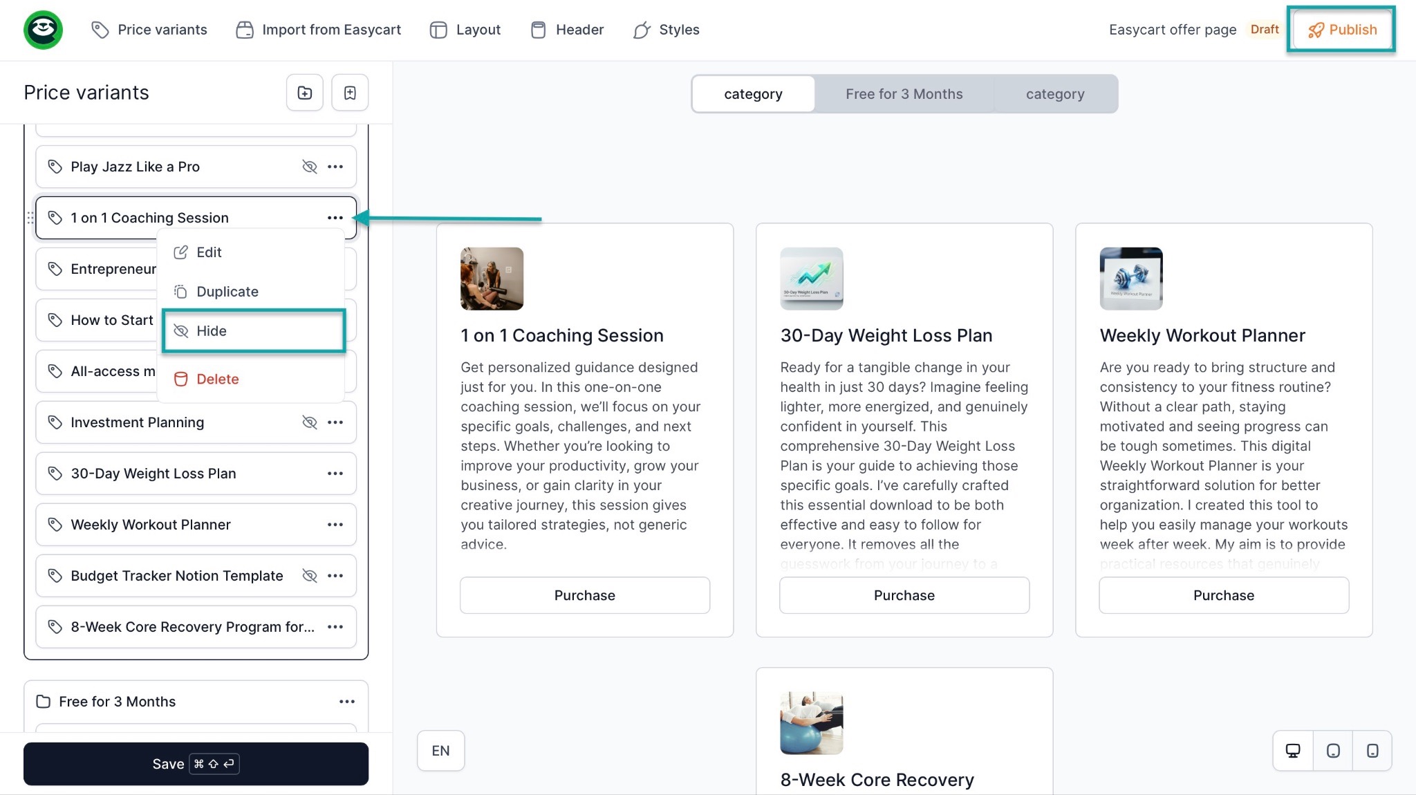 In the edit window, click the meatball menu (…) and select hide to display your best programs on the storefront. After that, hit “Save” at the bottom left of the window.
