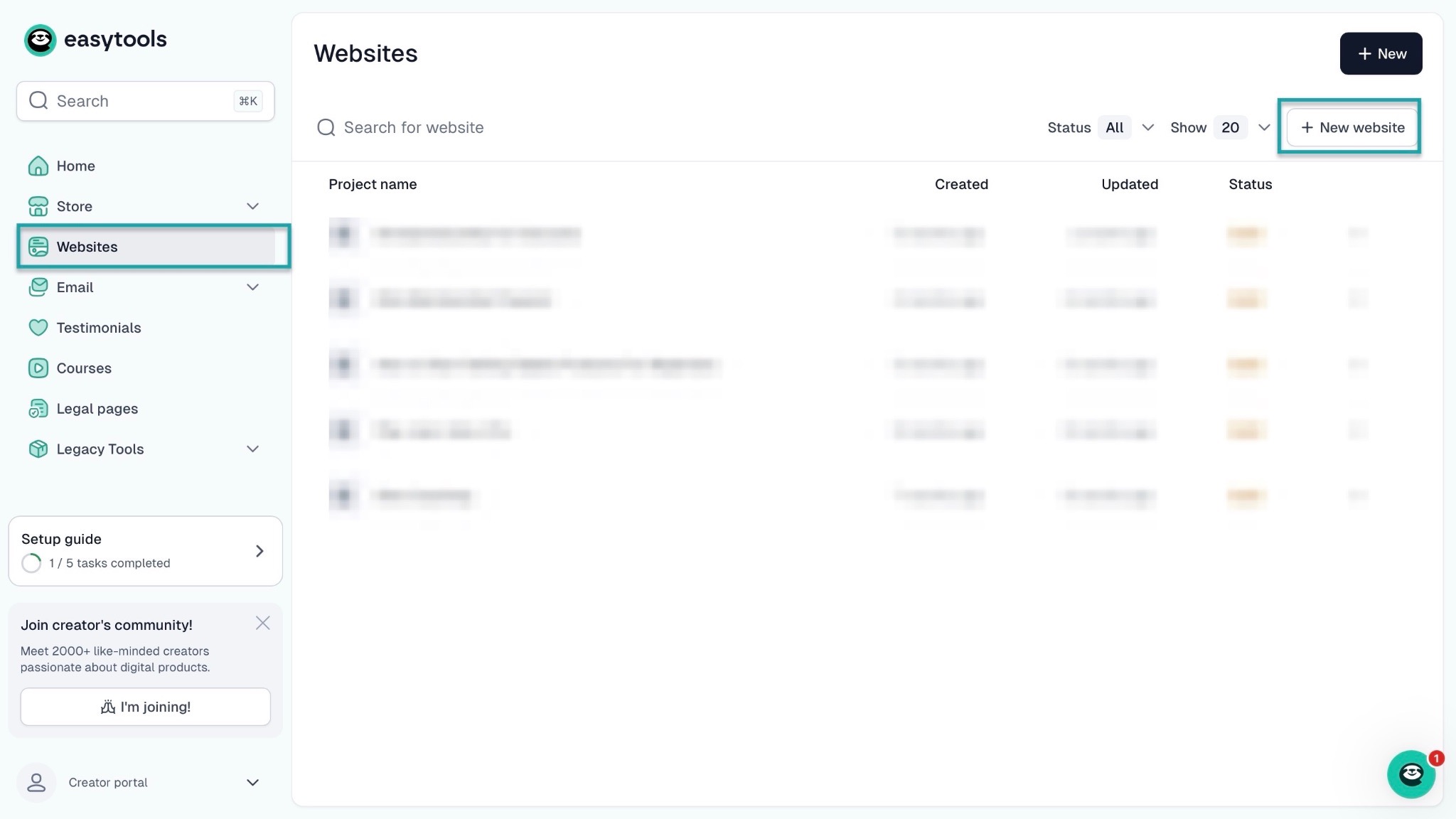 For a landing page, start by clicking “Website” in the sidebar. After that, click “+ New website.”