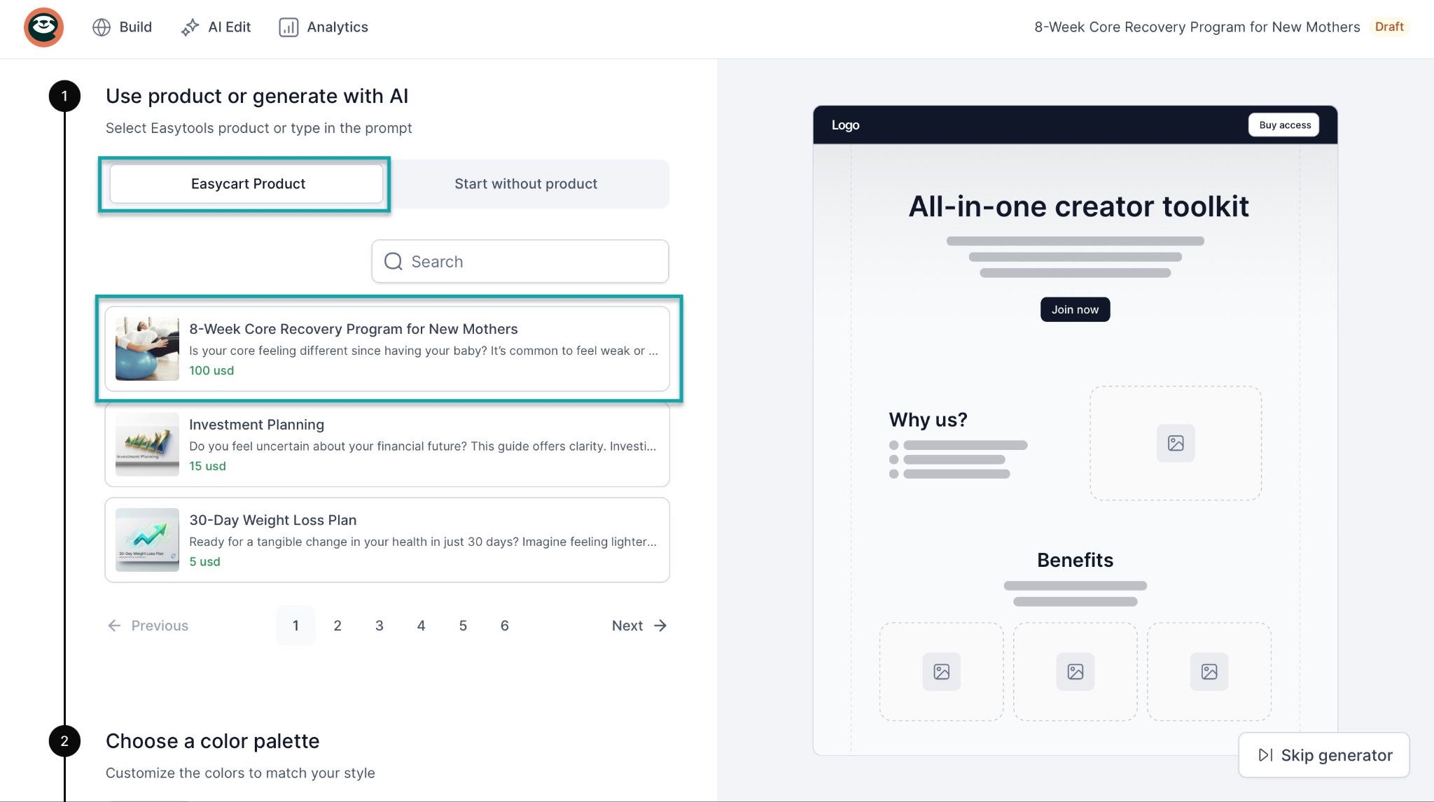 We’ve already created the checkout for the fitness program, so select “Easycart product” and click “8-Week Core Recovery Program for New Mothers.”