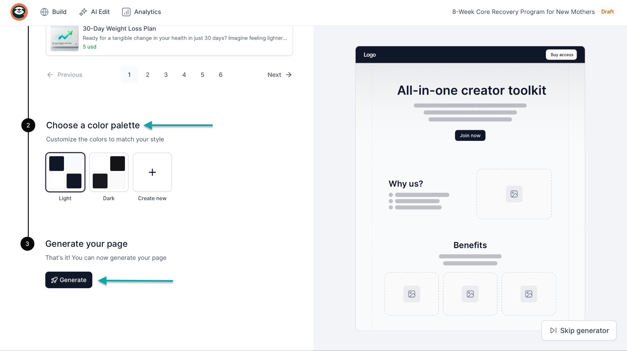 Now, scroll further down, pick a color palette, and hit “Generate.”