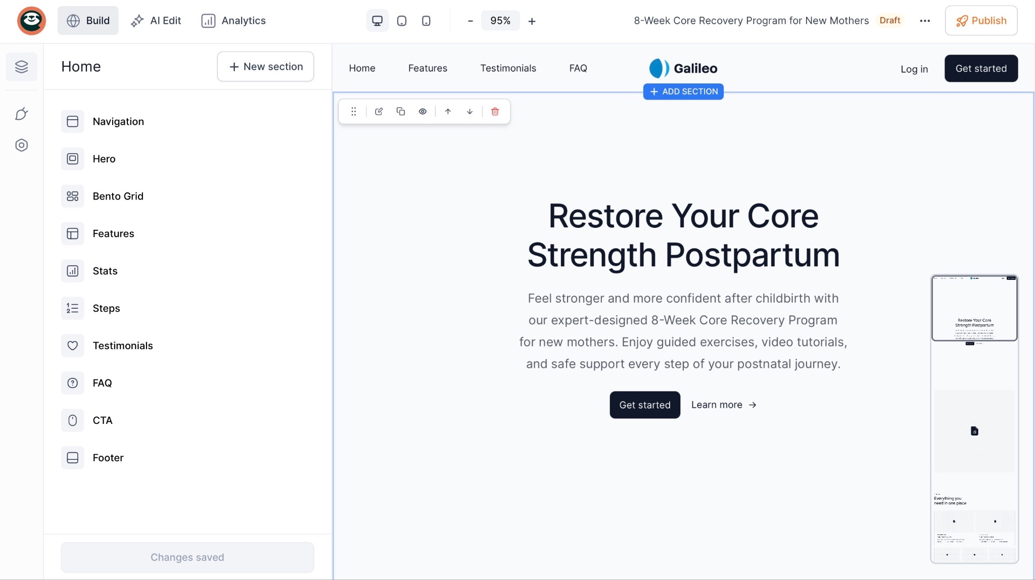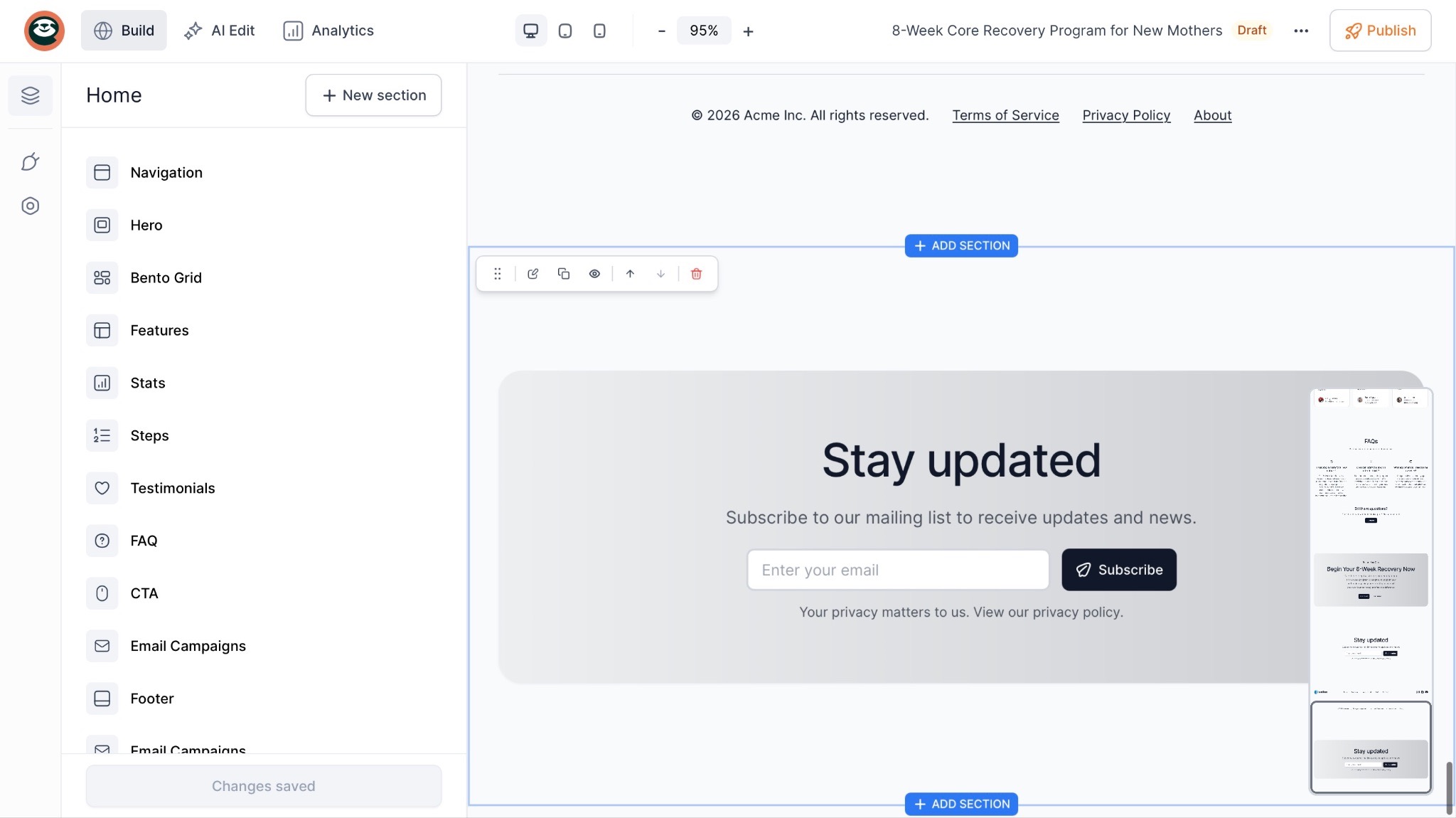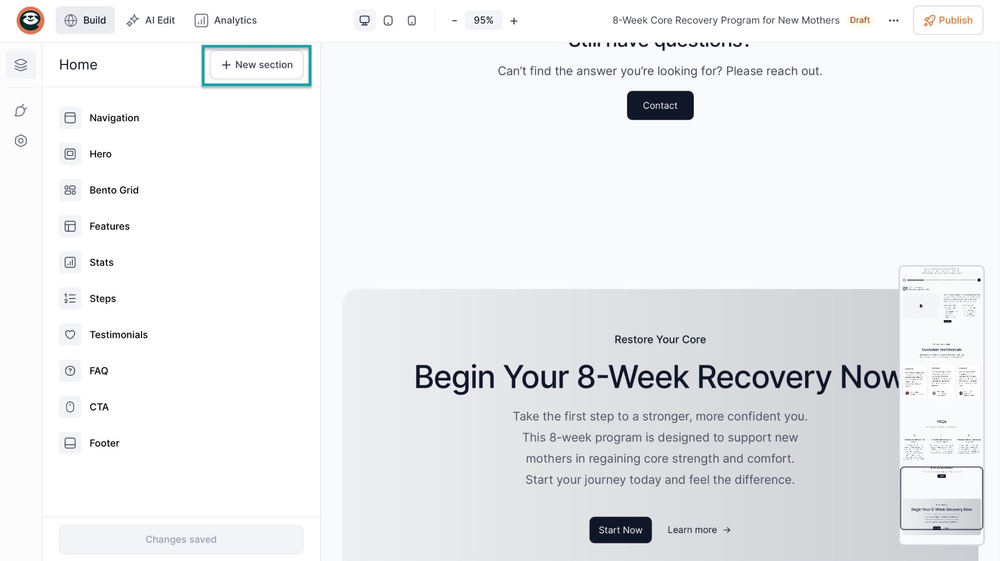In the landing page edit window, click the “+ New section” button.