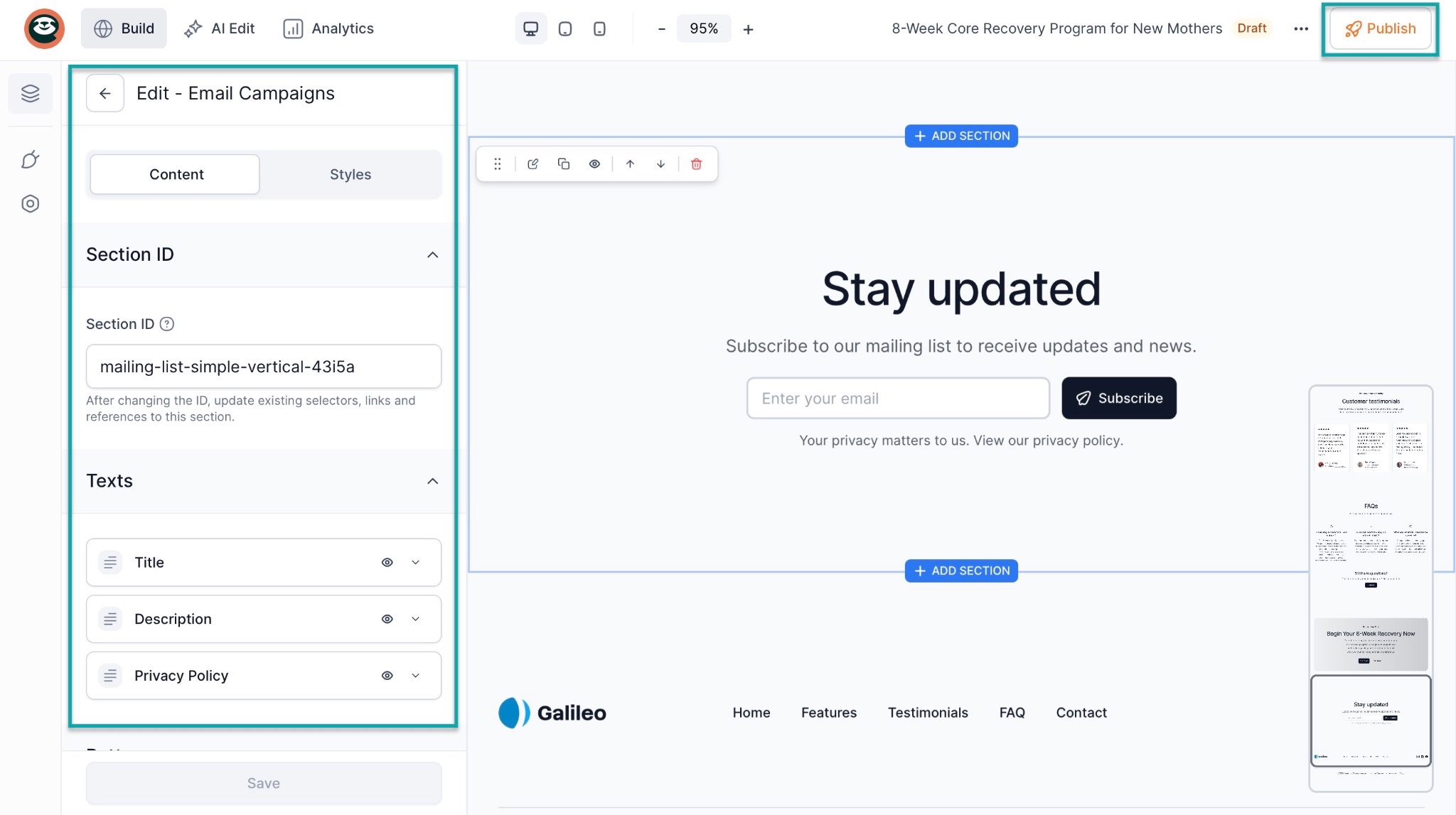 You can click “Email Campaigns,” which is now showing in the sidebar, to make further edits to that section.
