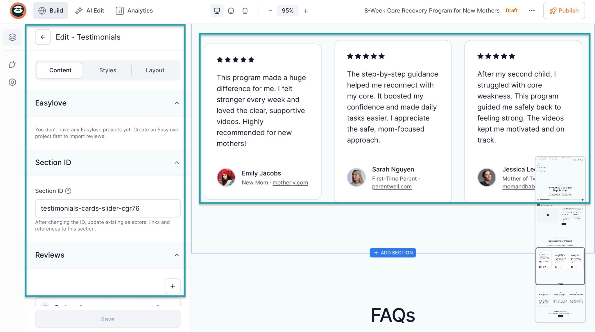 Because of their importance, testimonials are added as sections on the landing pages you create in Easytools.