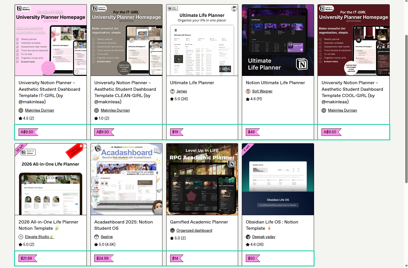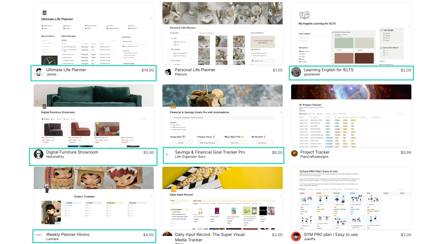 Many creators sell Notion templates, priced from $1 to $30+ per template.