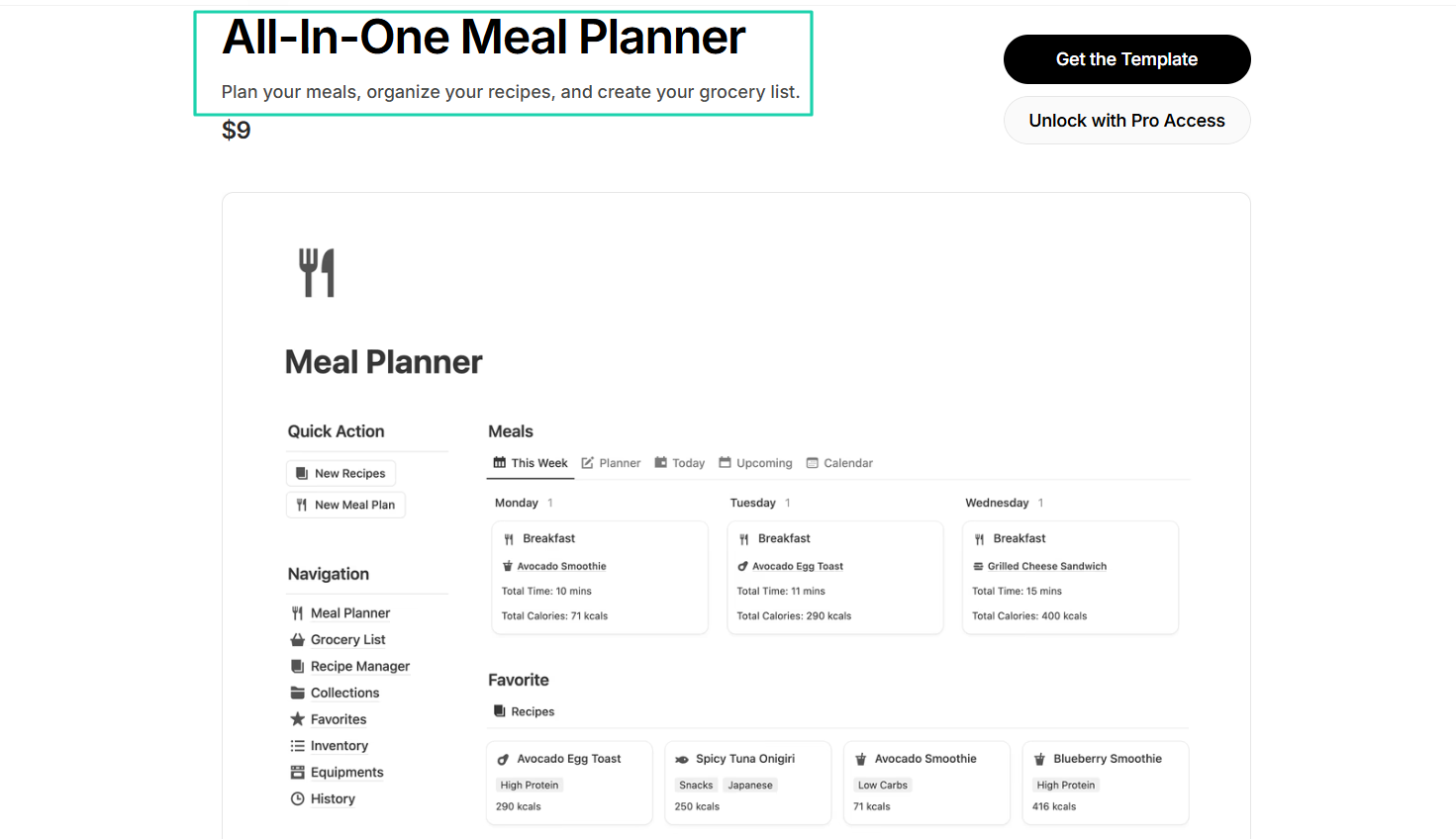 For example, this Notion template from Easlo called “All-in-one Meal Planner” is very specific. It’s for people who find it difficult to plan their meals, manage their favorite recipes, and track their grocery list.