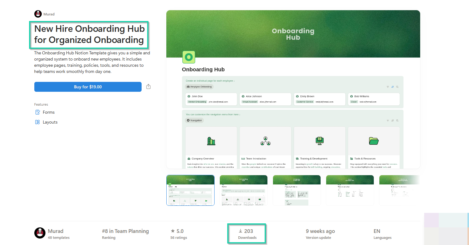 I’m also not surprised that over 200 people have already purchased Murad’s “New Hire Onboarding Hub for Organized Onboarding” Notion template.