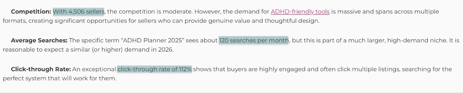 Take ADHD planners, for example. It has about 4,506 sellers offering it. It also has 120 searches per month and a 112% click-through rate.