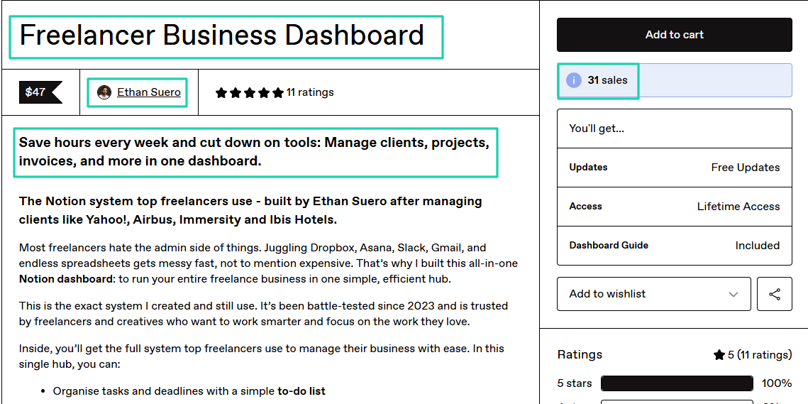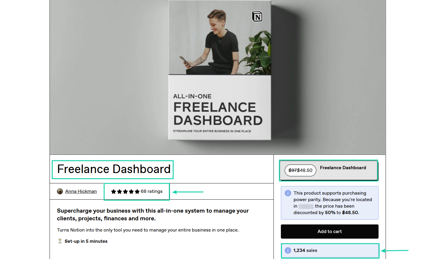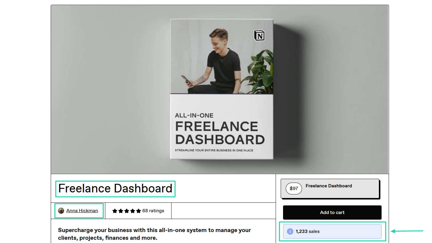 This “Freelance Dashboard” by Anna Hickman is an example. It costs $48.50 and has already sold 1,234 with 68 ratings.