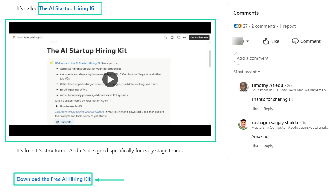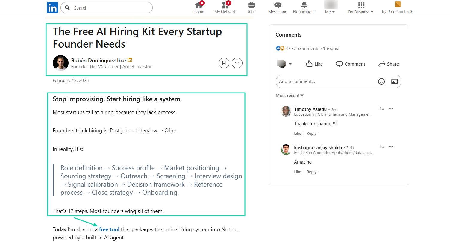The founder of VC Corner, Rubén Domínguez, shared a LinkedIn post promoting his free AI hiring kit for startup founders.