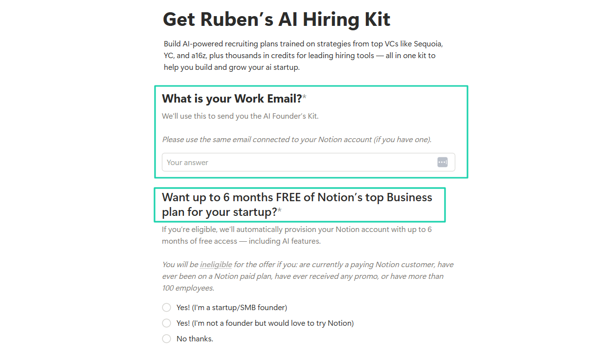 And to receive his free Notion template, buyers provide their work email address and answer a few questions.