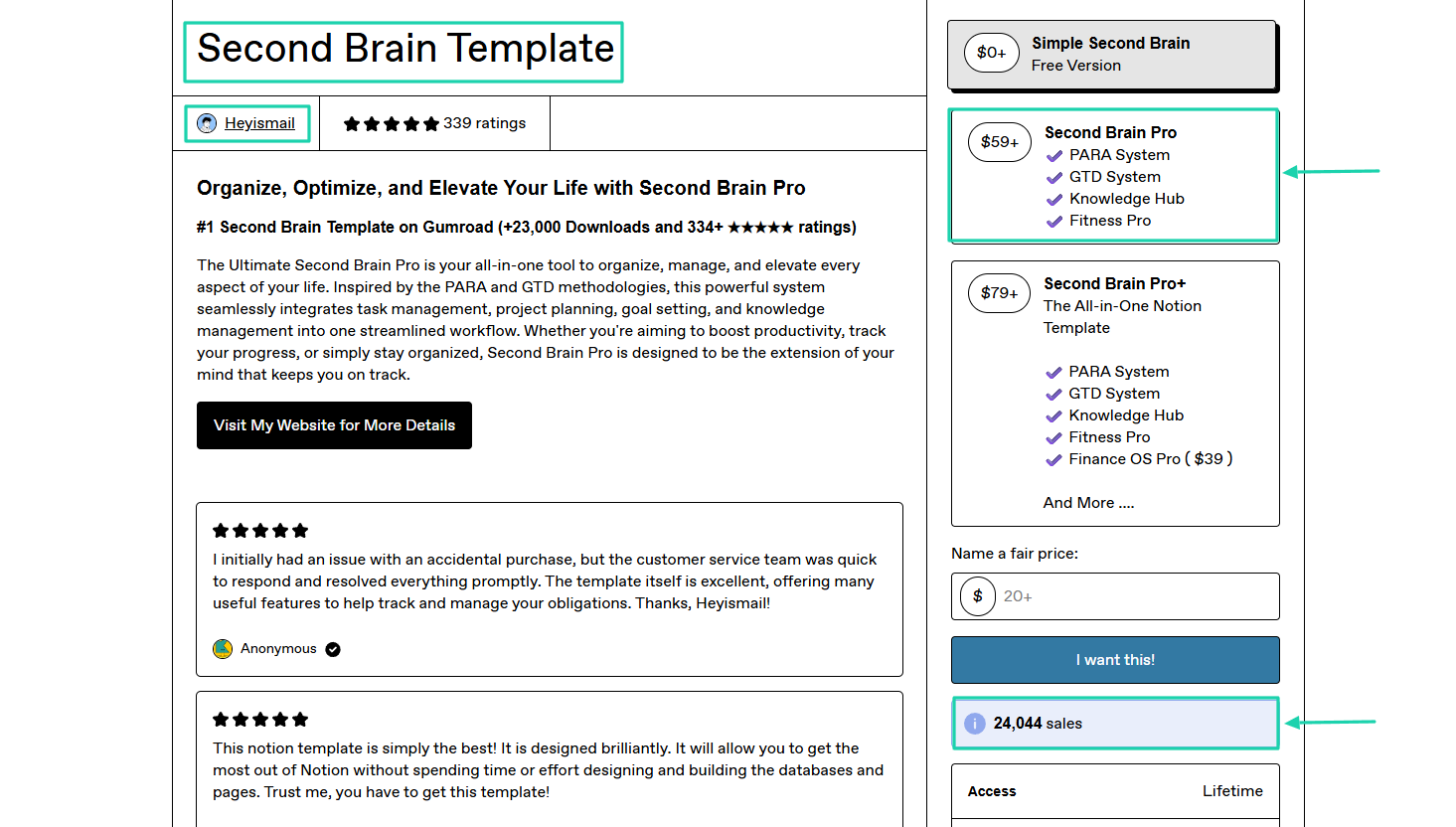 If a template has 24,044 in sales, we can conclude it really sells. That’s Heyismail’s Second Brain template.
