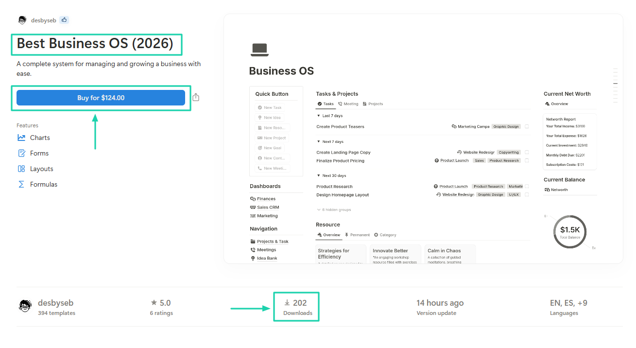 There is also the creator Desbyseb, selling a “Business OS” template for $124, and 202 have already bought it. People are really showing interest.