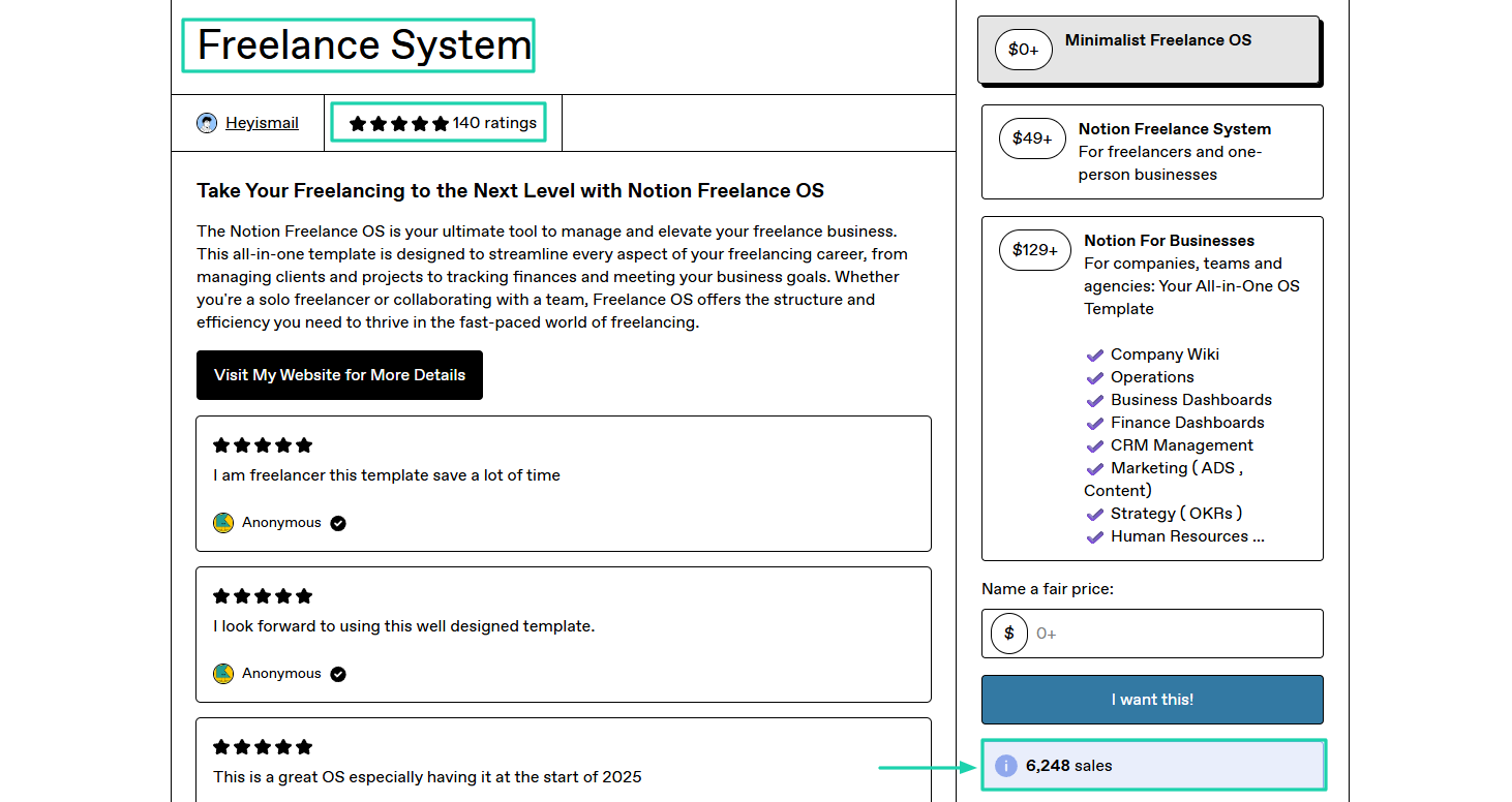 Heyismail’s “Freelance System,” priced at $49, has already made 6,248 sales. It also has 140 ratings.