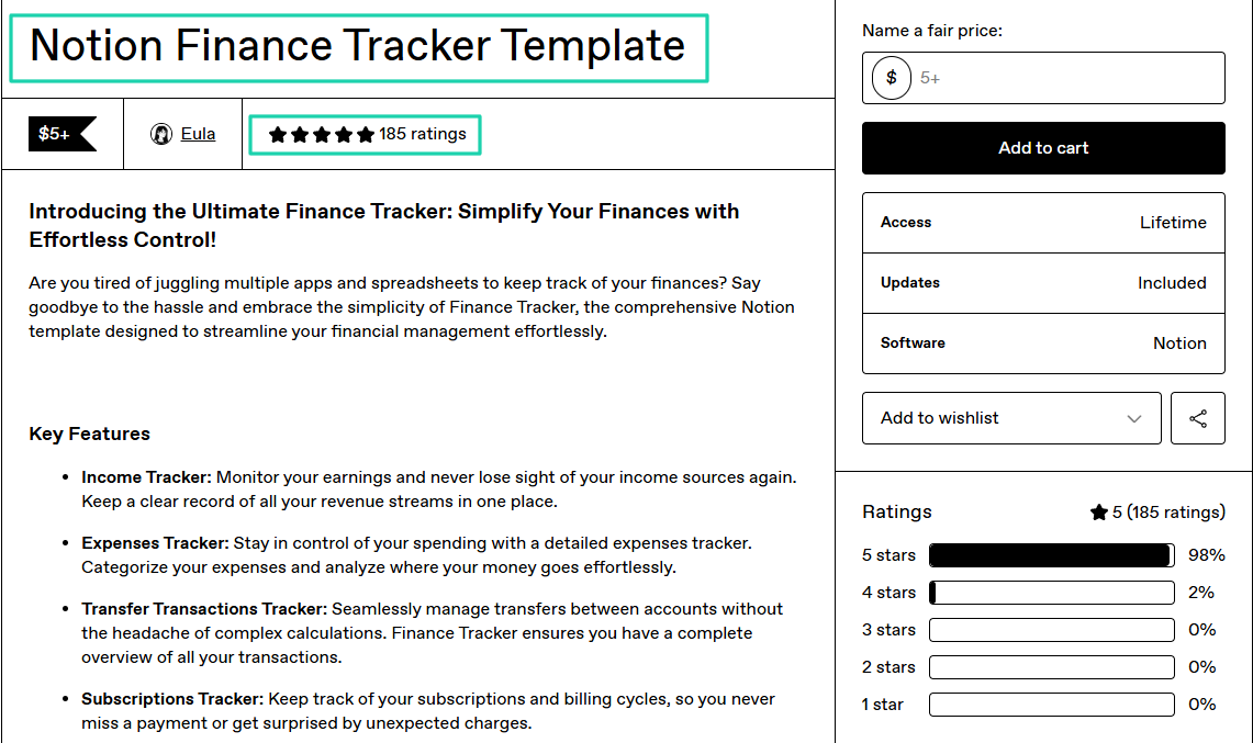 “Notion Finance Tracker Template” from Eula has around 185 ratings, with 5 stars at 98%.