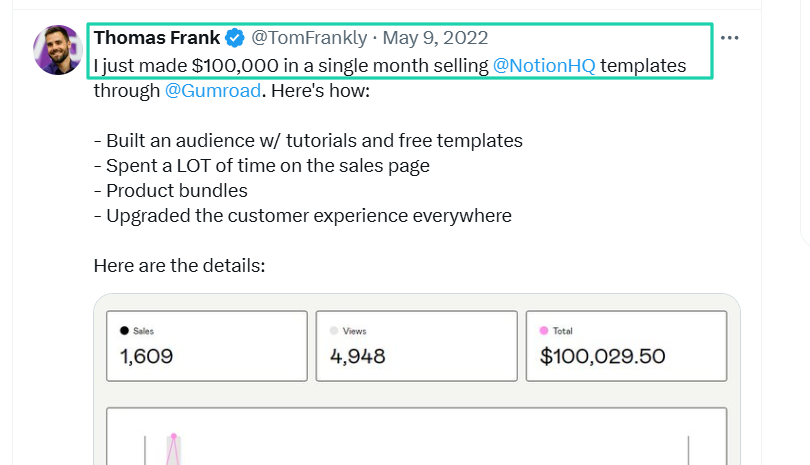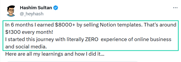 For example, Frank announced on X that he made $100,000 in a single month by selling Notion templates.