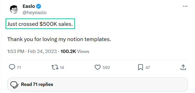 When Easlo crossed $500k, Jason Ruiyi thanked his Notion template users through a post on X.