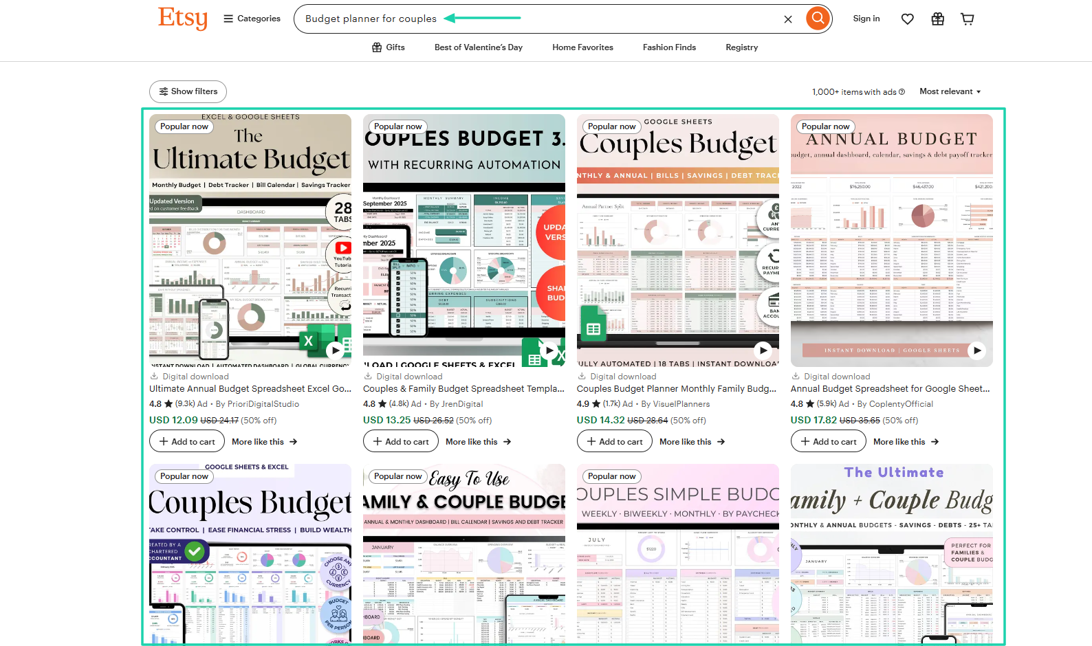 Another way is to check the marketplace and see how your PDF topic performs. Let’s say my PDF topic is “Budget planner for couples.”