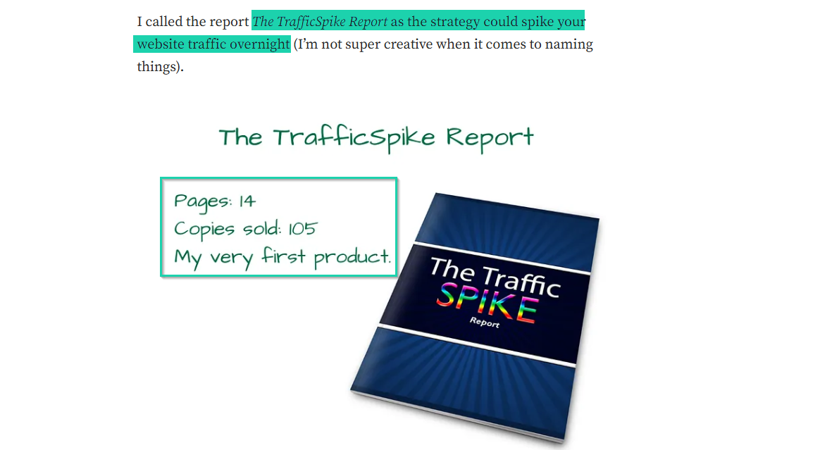 An example that comes to mind is Mathias. He created and sold the TrafficSpike Report to help people spike their website traffic overnight.