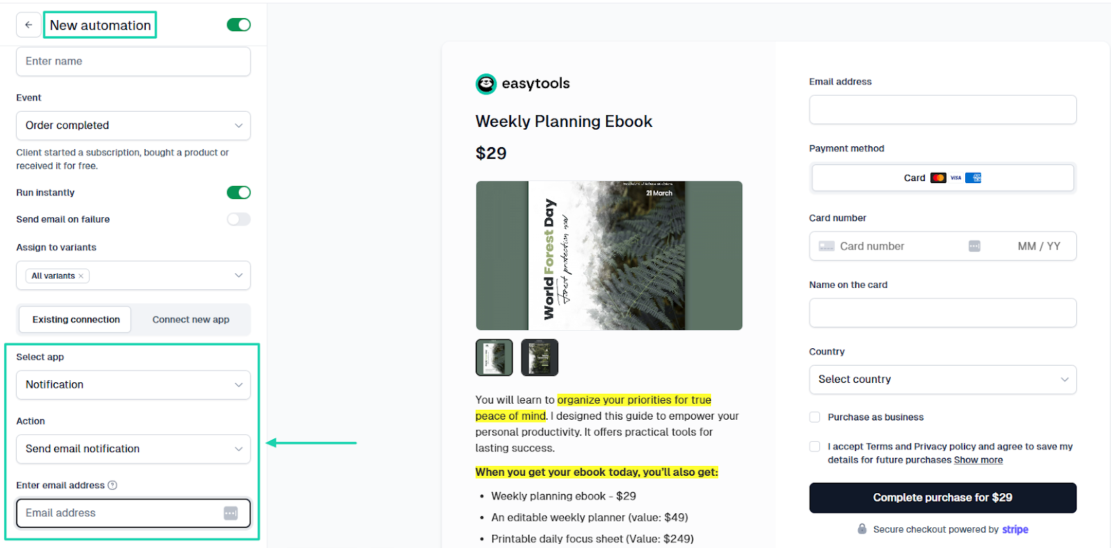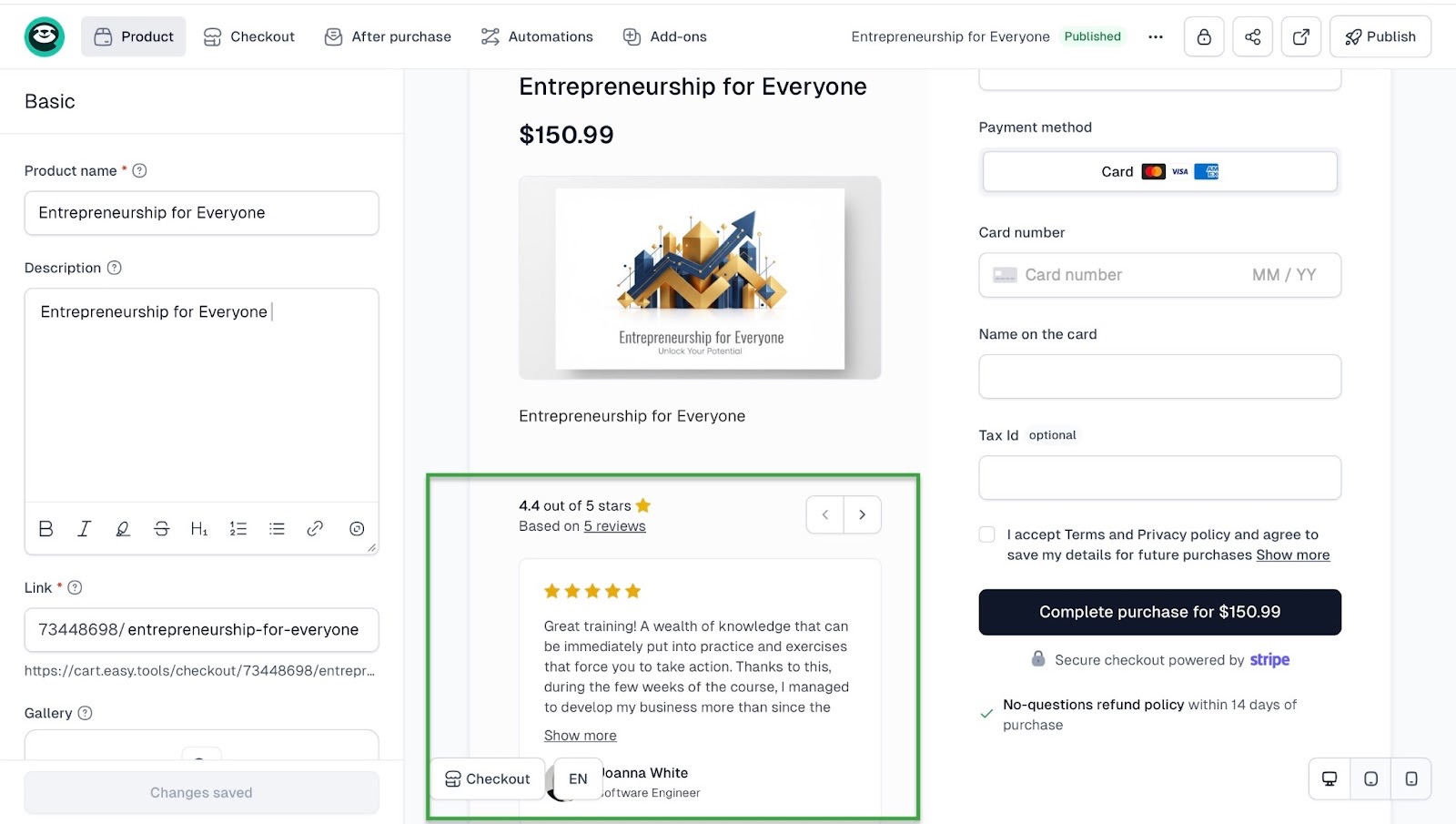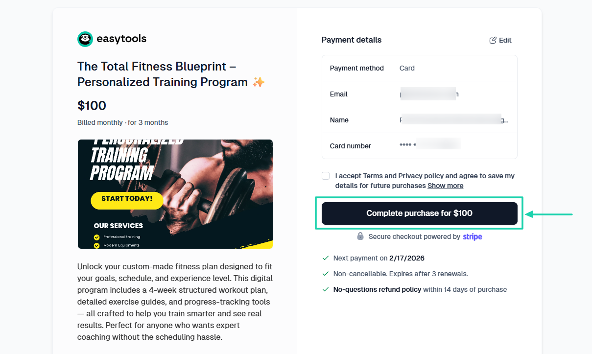 Compared to Stripe, you can fully customize your checkout page on Easytools to match your brand (logo, colors, fonts, button).