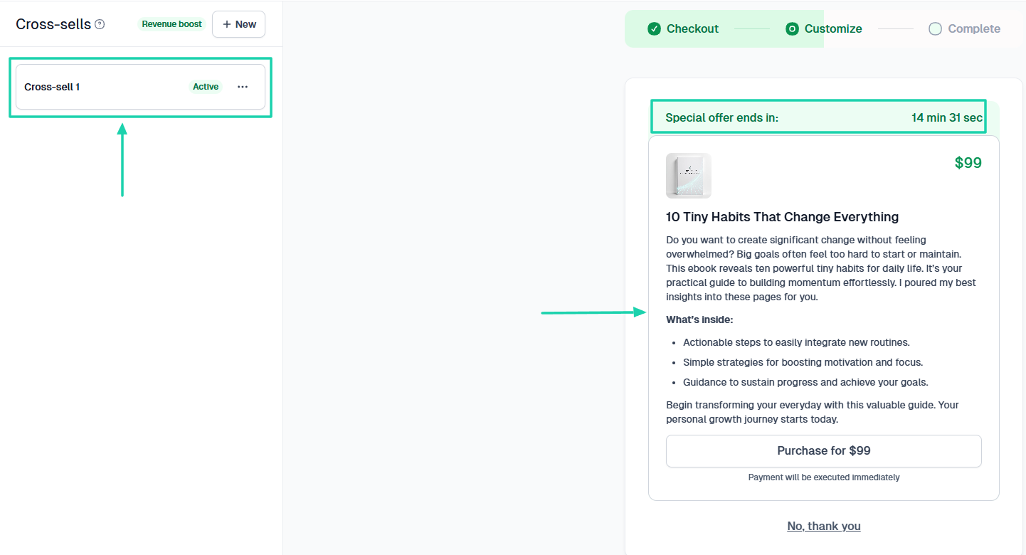 Another way to increase your conversions is to use features like cross-sells and upsells. It lets you show other products after a customer completes a transaction.