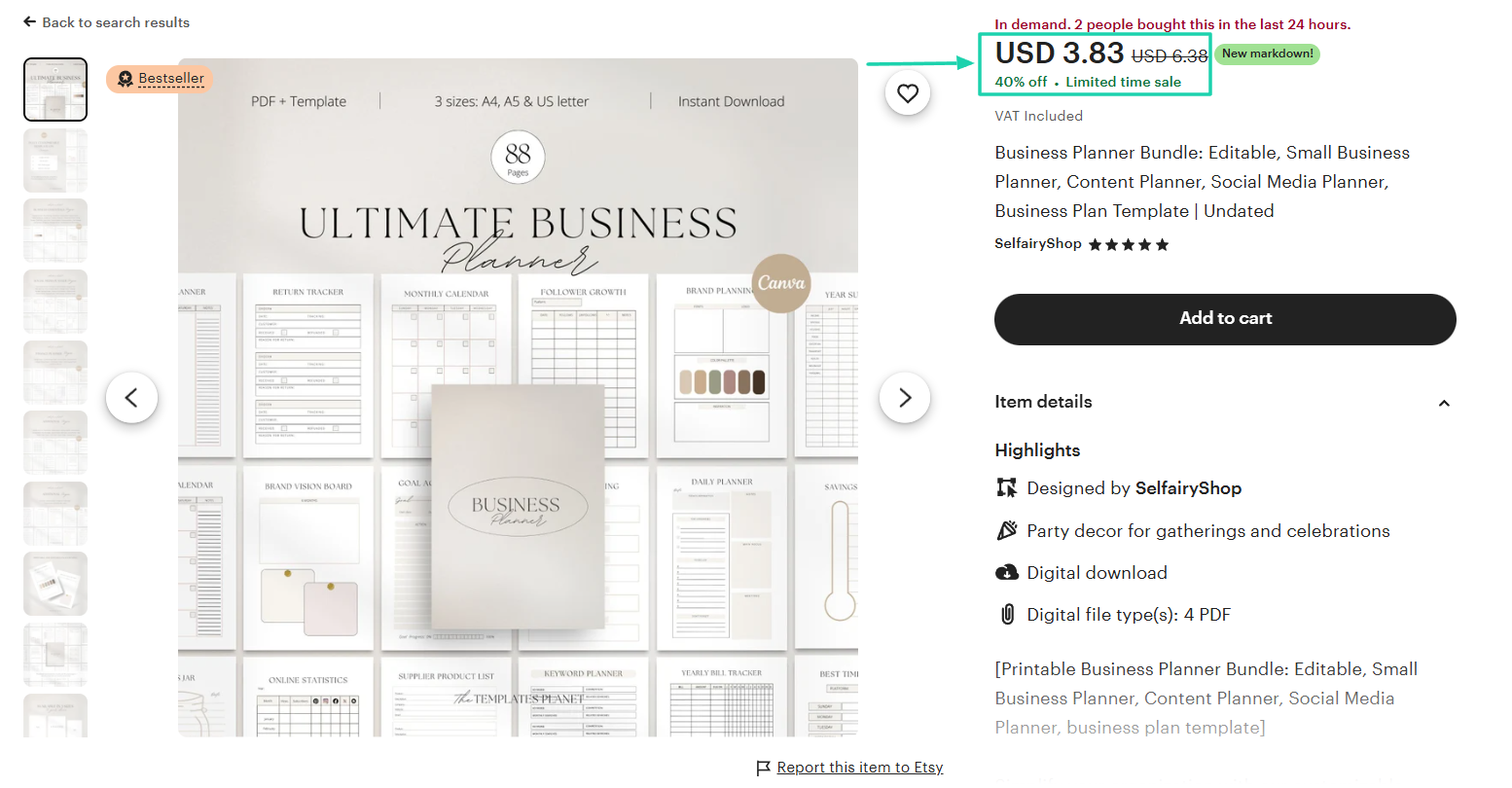 For instance, you can see that this business planner PDF was initially priced at $6.38. But it now comes with a 40% discount, so it's priced at $3.83.