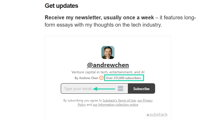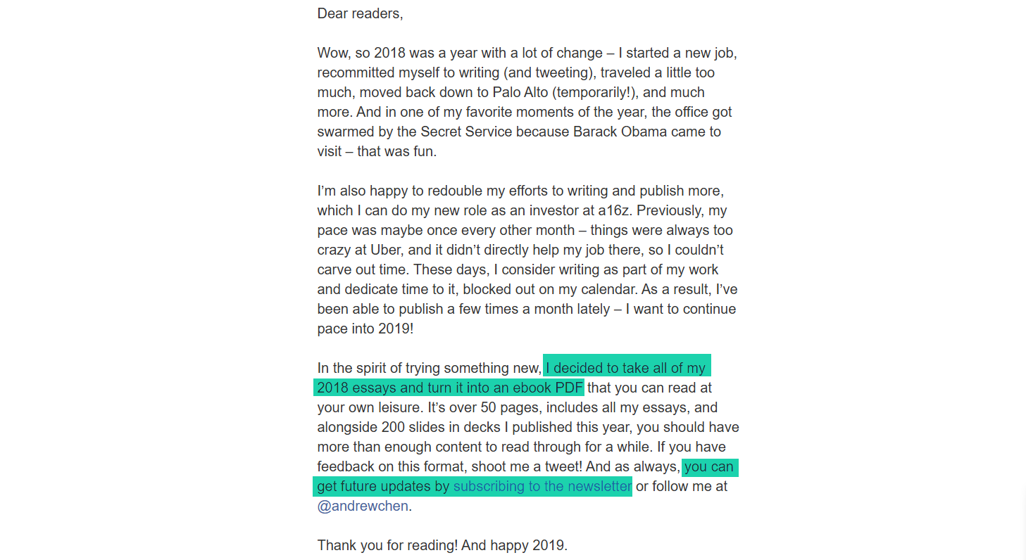 Take Andrew Chen, a well-known figure in the startup ecosystem. He wrote a letter some years ago in which he announced that turned all his 2018 essays into an e-book PDF.