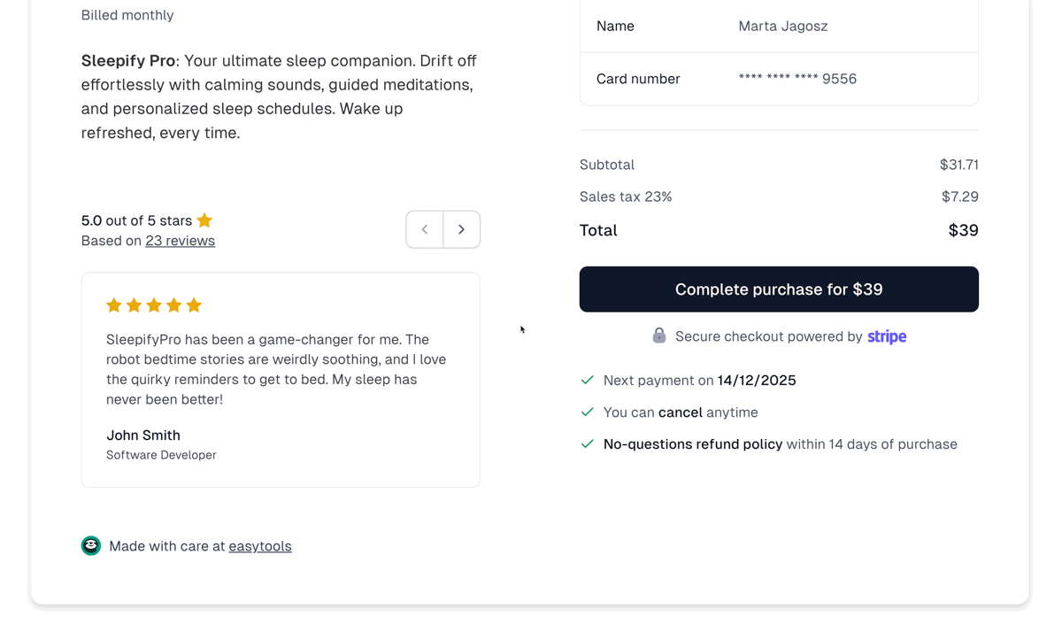If you were building this today, you could spin up the same one-page flow on Easytools in under ten minutes with a single CTA, built-in FAQ, optional variant pricing. Frank coded his from scratch. You seriously don’t have to.