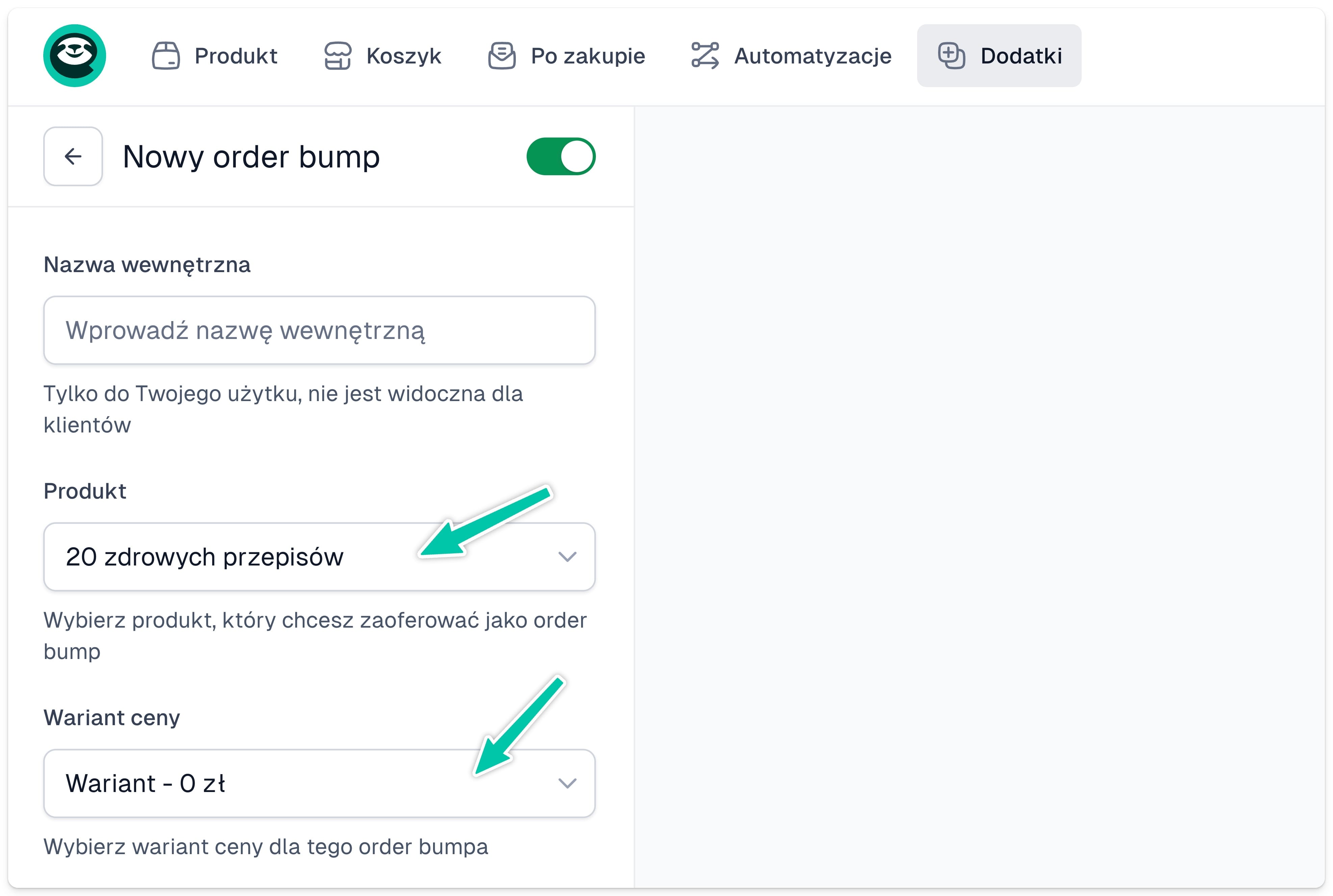 Ważne: Dodatkowa oferta musi mieć tą samą walutę co produkt w Twoim koszyku. Order bump może być przypisany do dowolnego typu produktu, ale oferta dodatkowa musi być produktem jednorazowym (order bump nie może być subskrypcją).