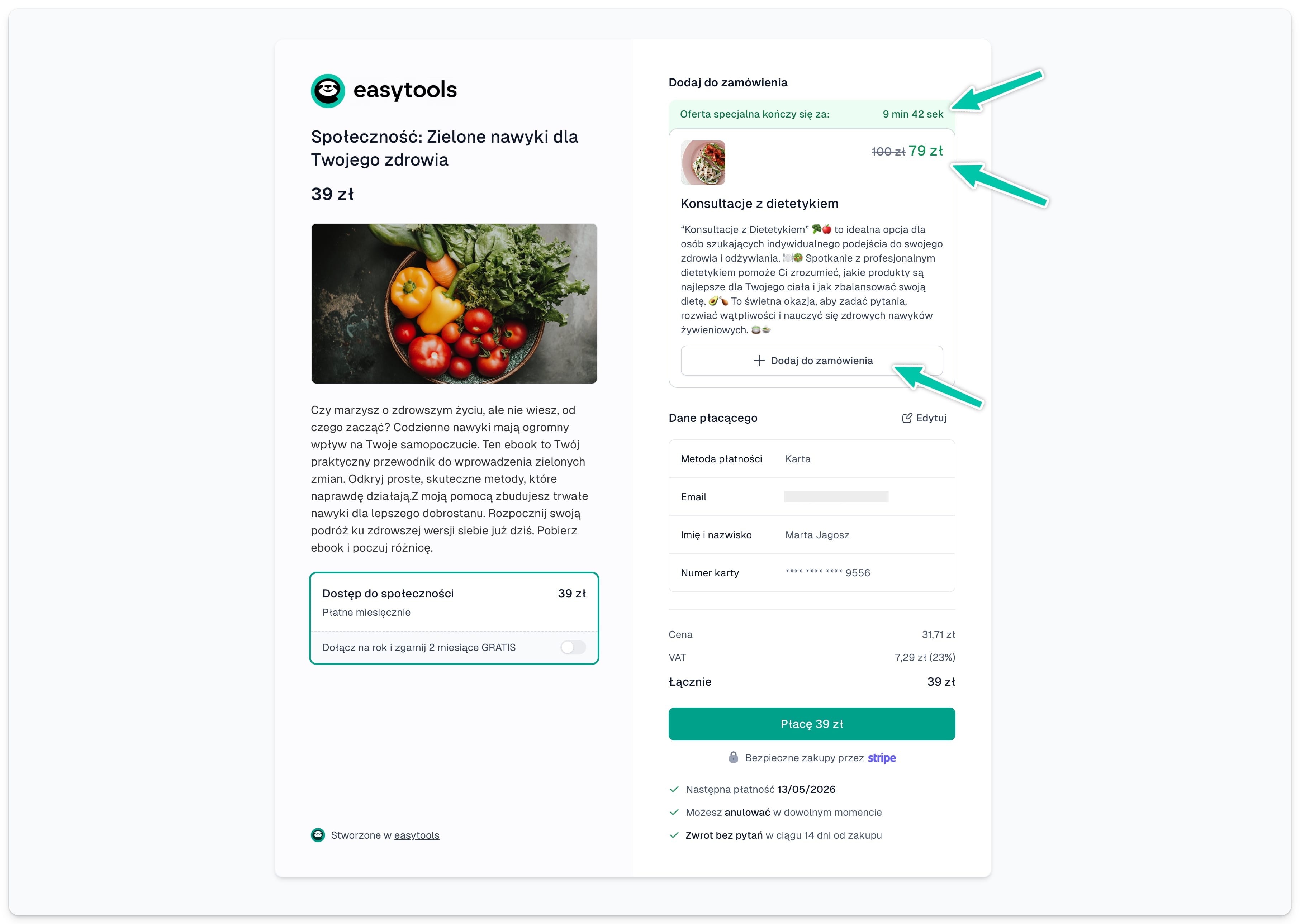 Easytools pozwala Ci oferować klientom produkty uzupełniające (order bumps) bezpośrednio w koszyku – jeszcze przed finalizacją zakupu.