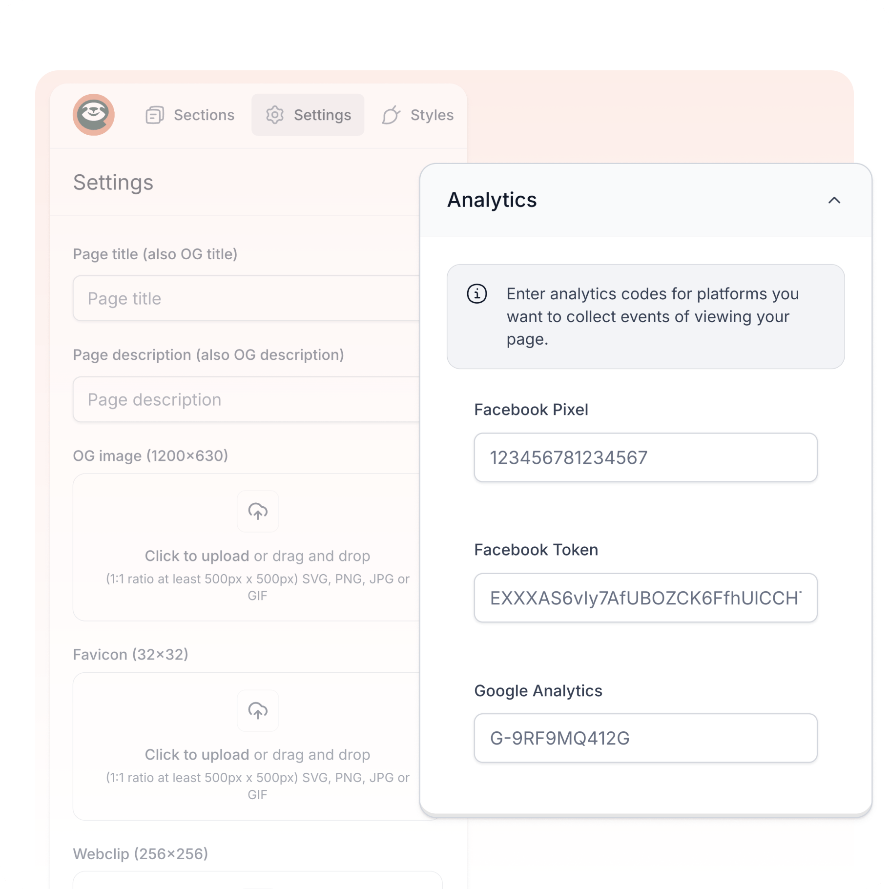 Analytics: Add tracking codes from Meta or Google to monitor user behavior on your page.